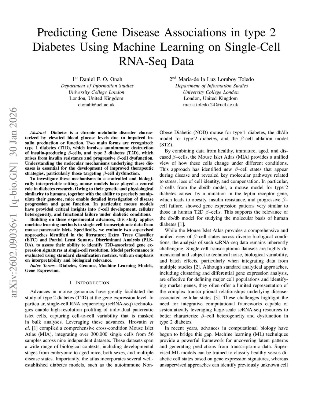 Diabetes is a chronic metabolic disorder characterized by elevated blood glucose levels due to impaired insulin production or function. Two main forms are recognized: type 1 diabetes (T1D), which involves autoimmune destruction of insulin-producing \b{eta}-cells, and type 2 diabetes (T2D), which arises from insulin resistance and progressive \b{eta}-cell dysfunction. Understanding the molecular mechanisms underlying these diseases is essential for the development of improved therapeutic strategies, particularly those targeting \b{eta}-cell dysfunction. To investigate these mechanisms in a controlled and biologically interpretable setting, mouse models have played a central role in diabetes research. Owing to their genetic and physiological similarity to humans, together with the ability to precisely manipulate their genome, mice enable detailed investigation of disease progression and gene function. In particular, mouse models have provided critical insights into \b{eta}-cell development, cellular heterogeneity, and functional failure under diabetic conditions. Building on these experimental advances, this study applies machine learning methods to single-cell transcriptomic data from mouse pancreatic islets. Specifically, we evaluate two supervised approaches identified in the literature; Extra Trees Classifier (ETC) and Partial Least Squares Discriminant Analysis (PLS-DA), to assess their ability to identify T2D-associated gene expression signatures at single-cell resolution. Model performance is evaluated using standard classification metrics, with an emphasis on interpretability and biological relevance