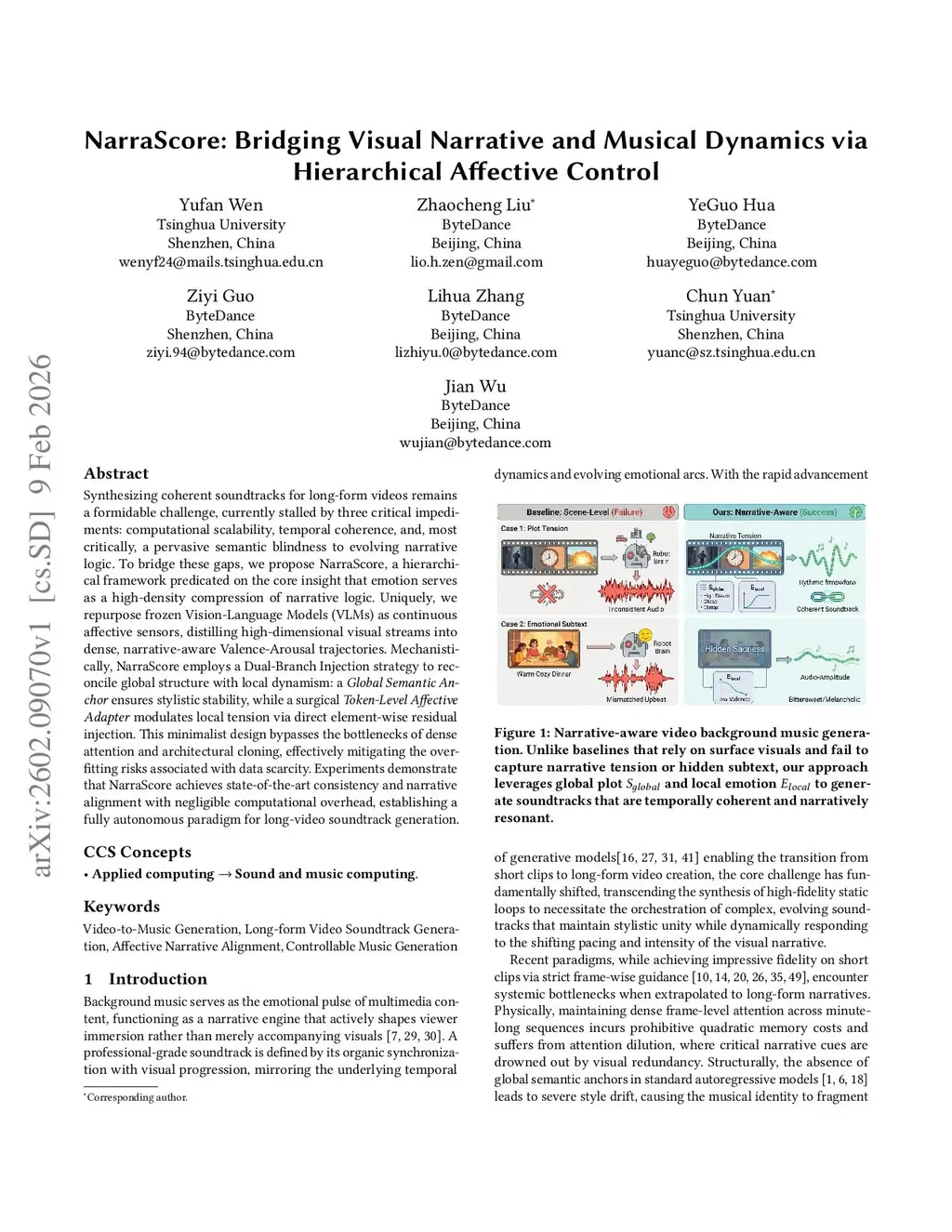 Synthesizing coherent soundtracks for long-form videos remains a formidable challenge, currently stalled by three critical impediments: computational scalability, temporal coherence, and, most critically, a pervasive semantic blindness to evolving narrative logic. To bridge these gaps, we propose NarraScore, a hierarchical framework predicated on the core insight that emotion serves as a high-density compression of narrative logic. Uniquely, we repurpose frozen Vision-Language Models (VLMs) as continuous affective sensors, distilling high-dimensional visual streams into dense, narrative-aware Valence-Arousal trajectories. Mechanistically, NarraScore employs a Dual-Branch Injection strategy to reconcile global structure with local dynamism: a \textit{Global Semantic Anchor} ensures stylistic stability, while a surgical \textit{Token-Level Affective Adapter} modulates local tension via direct element-wise residual injection. This minimalist design bypasses the bottlenecks of dense attention and architectural cloning, effectively mitigating the overfitting risks associated with data scarcity. Experiments demonstrate that NarraScore achieves state-of-the-art consistency and narrative alignment with negligible computational overhead, establishing a fully autonomous paradigm for long-video soundtrack generation.