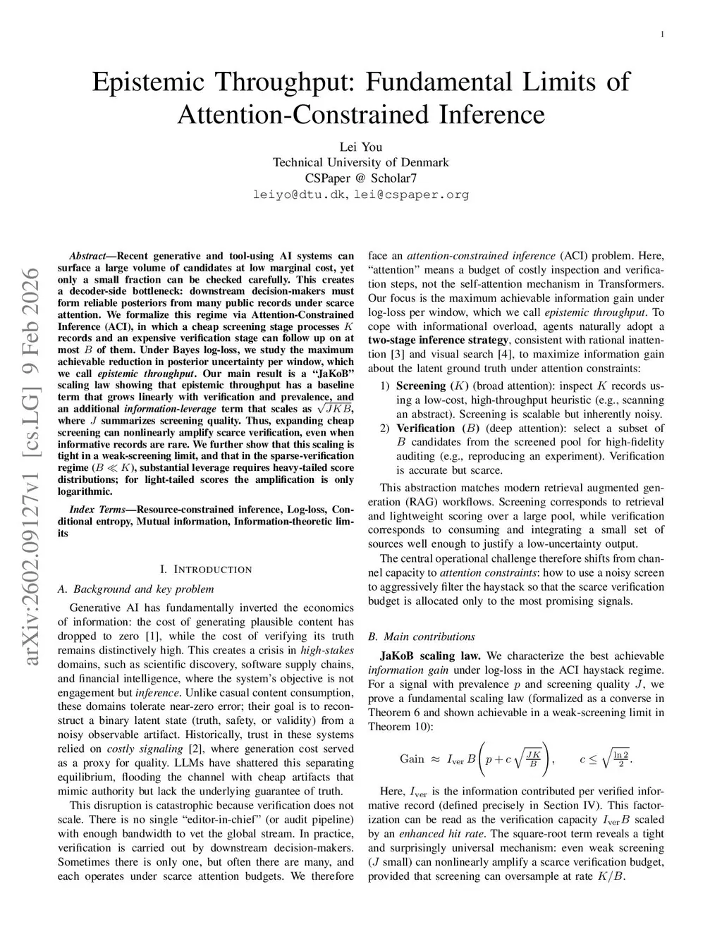 Recent generative and tool-using AI systems can surface a large volume of candidates at low marginal cost, yet only a small fraction can be checked carefully. This creates a decoder-side bottleneck: downstream decision-makers must form reliable posteriors from many public records under scarce attention. We formalize this regime via Attention-Constrained Inference (ACI), in which a cheap screening stage processes records and an expensive verification stage can follow up on at most of them. Under Bayes log-loss, we study the maximum achievable reduction in posterior uncertainty per window, which we call \emph{epistemic throughput}. Our main result is a ``JaKoB'' scaling law showing that epistemic throughput has a baseline term that grows linearly with verification and prevalence, and an additional \emph{information-leverage} term that scales as , where summarizes screening quality. Thus, expanding cheap screening can nonlinearly amplify scarce verification, even when informative records are rare. We further show that this scaling is tight in a weak-screening limit, and that in the sparse-verification regime (), substantial leverage requires heavy-tailed score distributions; for light-tailed scores the amplification is only logarithmic.