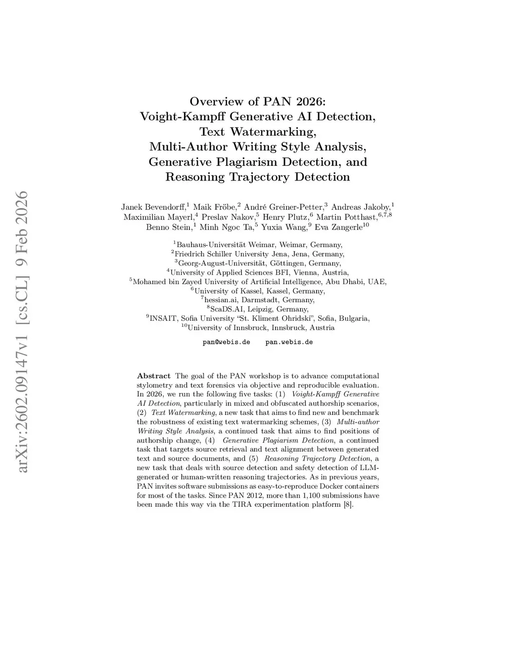 The goal of the PAN workshop is to advance computational stylometry and text forensics via objective and reproducible evaluation. In 2026, we run the following five tasks: (1) Voight-Kampff Generative AI Detection, particularly in mixed and obfuscated authorship scenarios, (2) Text Watermarking, a new task that aims to find new and benchmark the robustness of existing text watermarking schemes, (3) Multi-author Writing Style Analysis, a continued task that aims to find positions of authorship change, (4) Generative Plagiarism Detection, a continued task that targets source retrieval and text alignment between generated text and source documents, and (5) Reasoning Trajectory Detection, a new task that deals with source detection and safety detection of LLM-generated or human-written reasoning trajectories. As in previous years, PAN invites software submissions as easy-to-reproduce Docker containers for most of the tasks. Since PAN 2012, more than 1,100 submissions have been made this way via the TIRA experimentation platform.