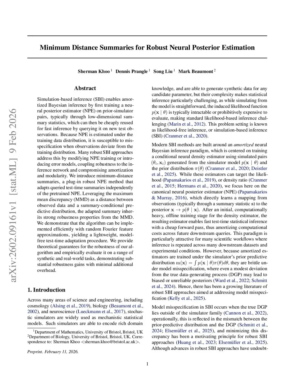 Simulation-based inference (SBI) enables amortized Bayesian inference by first training a neural posterior estimator (NPE) on prior-simulator pairs, typically through low-dimensional summary statistics, which can then be cheaply reused for fast inference by querying it on new test observations. Because NPE is estimated under the training data distribution, it is susceptible to misspecification when observations deviate from the training distribution. Many robust SBI approaches address this by modifying NPE training or introducing error models, coupling robustness to the inference network and compromising amortization and modularity. We introduce minimum-distance summaries, a plug-in robust NPE method that adapts queried test-time summaries independently of the pretrained NPE. Leveraging the maximum mean discrepancy (MMD) as a distance between observed data and a summary-conditional predictive distribution, the adapted summary inherits strong robustness properties from the MMD. We demonstrate that the algorithm can be implemented efficiently with random Fourier feature approximations, yielding a lightweight, model-free test-time adaptation procedure. We provide theoretical guarantees for the robustness of our algorithm and empirically evaluate it on a range of synthetic and real-world tasks, demonstrating substantial robustness gains with minimal additional overhead.