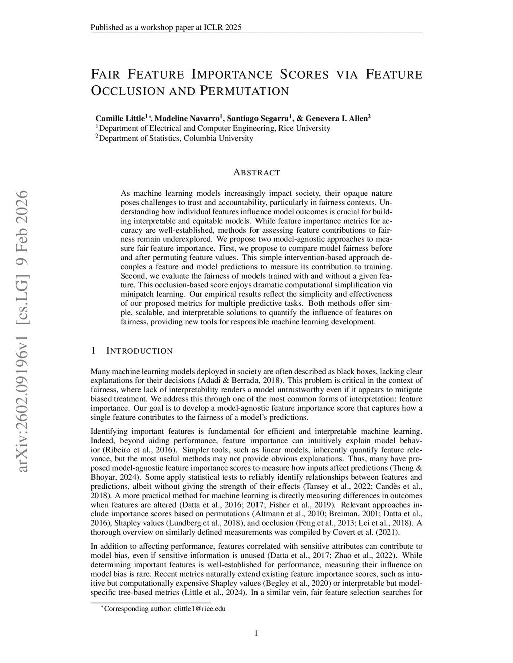 As machine learning models increasingly impact society, their opaque nature poses challenges to trust and accountability, particularly in fairness contexts. Understanding how individual features influence model outcomes is crucial for building interpretable and equitable models. While feature importance metrics for accuracy are well-established, methods for assessing feature contributions to fairness remain underexplored. We propose two model-agnostic approaches to measure fair feature importance. First, we propose to compare model fairness before and after permuting feature values. This simple intervention-based approach decouples a feature and model predictions to measure its contribution to training. Second, we evaluate the fairness of models trained with and without a given feature. This occlusion-based score enjoys dramatic computational simplification via minipatch learning. Our empirical results reflect the simplicity and effectiveness of our proposed metrics for multiple predictive tasks. Both methods offer simple, scalable, and interpretable solutions to quantify the influence of features on fairness, providing new tools for responsible machine learning development.