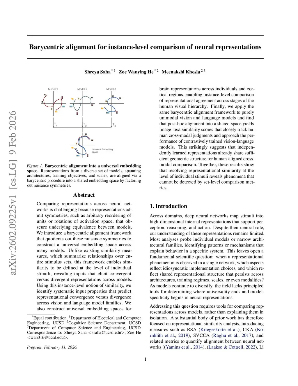 Comparing representations across neural networks is challenging because representations admit symmetries, such as arbitrary reordering of units or rotations of activation space, that obscure underlying equivalence between models. We introduce a barycentric alignment framework that quotients out these nuisance symmetries to construct a universal embedding space across many models. Unlike existing similarity measures, which summarize relationships over entire stimulus sets, this framework enables similarity to be defined at the level of individual stimuli, revealing inputs that elicit convergent versus divergent representations across models. Using this instance-level notion of similarity, we identify systematic input properties that predict representational convergence versus divergence across vision and language model families. We also construct universal embedding spaces for brain representations across individuals and cortical regions, enabling instance-level comparison of representational agreement across stages of the human visual hierarchy. Finally, we apply the same barycentric alignment framework to purely unimodal vision and language models and find that post-hoc alignment into a shared space yields image text similarity scores that closely track human cross-modal judgments and approach the performance of contrastively trained vision-language models. This strikingly suggests that independently learned representations already share sufficient geometric structure for human-aligned cross-modal comparison. Together, these results show that resolving representational similarity at the level of individual stimuli reveals phenomena that cannot be detected by set-level comparison metrics.