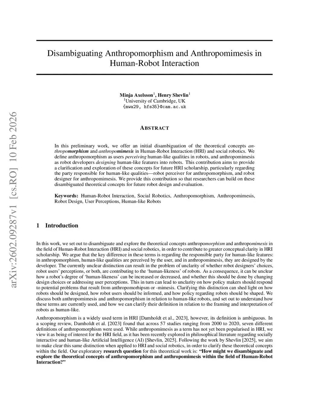 In this preliminary work, we offer an initial disambiguation of the theoretical concepts anthropomorphism and anthropomimesis in Human-Robot Interaction (HRI) and social robotics. We define anthropomorphism as users perceiving human-like qualities in robots, and anthropomimesis as robot developers designing human-like features into robots. This contribution aims to provide a clarification and exploration of these concepts for future HRI scholarship, particularly regarding the party responsible for human-like qualities - robot perceiver for anthropomorphism, and robot designer for anthropomimesis. We provide this contribution so that researchers can build on these disambiguated theoretical concepts for future robot design and evaluation.