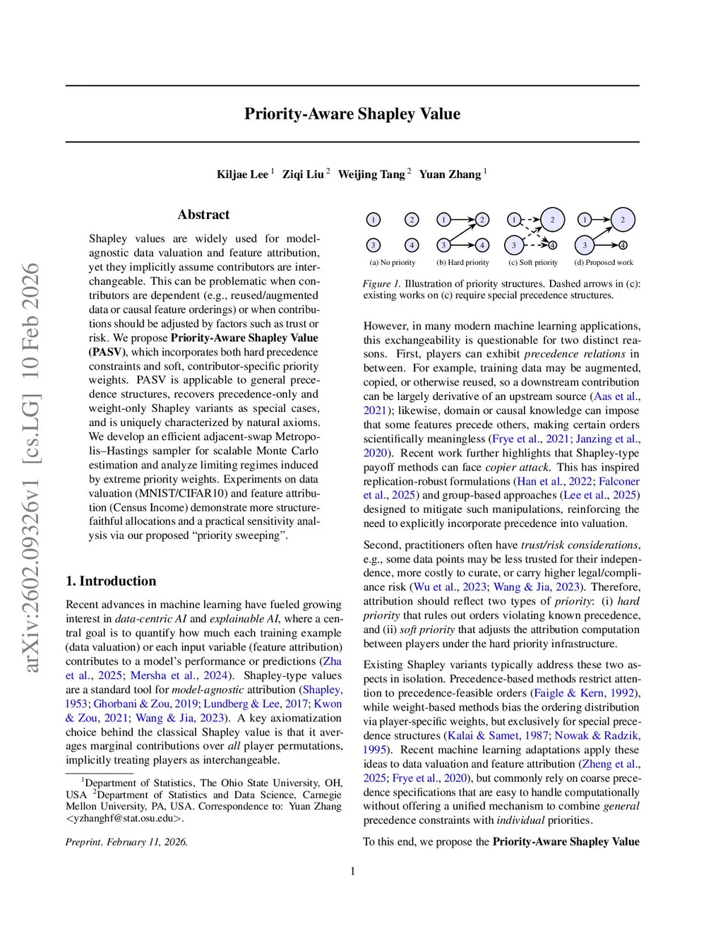 Shapley values are widely used for model-agnostic data valuation and feature attribution, yet they implicitly assume contributors are interchangeable. This can be problematic when contributors are dependent (e.g., reused/augmented data or causal feature orderings) or when contributions should be adjusted by factors such as trust or risk. We propose Priority-Aware Shapley Value (PASV), which incorporates both hard precedence constraints and soft, contributor-specific priority weights. PASV is applicable to general precedence structures, recovers precedence-only and weight-only Shapley variants as special cases, and is uniquely characterized by natural axioms. We develop an efficient adjacent-swap Metropolis-Hastings sampler for scalable Monte Carlo estimation and analyze limiting regimes induced by extreme priority weights. Experiments on data valuation (MNIST/CIFAR10) and feature attribution (Census Income) demonstrate more structure-faithful allocations and a practical sensitivity analysis via our proposed "priority sweeping".