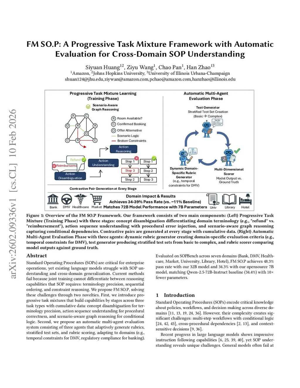 Standard Operating Procedures (SOPs) are critical for enterprise operations, yet existing language models struggle with SOP understanding and cross-domain generalization. Current methods fail because joint training cannot differentiate between reasoning capabilities that SOP requires: terminology precision, sequential ordering, and constraint reasoning. We propose FM SO.P, solving these challenges through two novelties. First, we introduce progressive task mixtures that build capabilities by stages across three task types with cumulative data: concept disambiguation for terminology precision, action sequence understanding for procedural correctness, and scenario-aware graph reasoning for conditional logic. Second, we propose an automatic multi-agent evaluation system consisting of three agents that adaptively generate rubrics, stratified test sets, and rubric scoring, adapting to domains (e.g., temporal constraints for DMV, regulatory compliance for banking). Evaluated on SOPBench across seven domains (Bank, DMV, Healthcare, Market, University, Library, Hotel), FM SO.P achieves 48.3\% pass rate with our 32B model and 34.3\% with our opensource 7B model, matching Qwen-2.5-72B-Instruct baseline (34.4\%) with 10x fewer parameters.