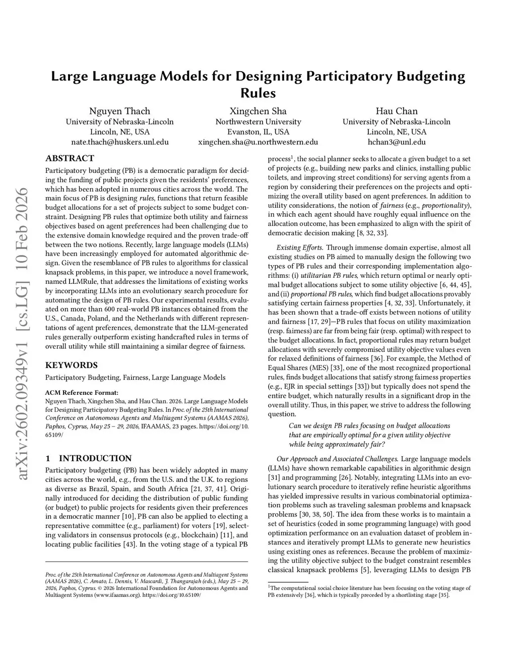 Participatory budgeting (PB) is a democratic paradigm for deciding the funding of public projects given the residents' preferences, which has been adopted in numerous cities across the world. The main focus of PB is designing rules, functions that return feasible budget allocations for a set of projects subject to some budget constraint. Designing PB rules that optimize both utility and fairness objectives based on agent preferences had been challenging due to the extensive domain knowledge required and the proven trade-off between the two notions. Recently, large language models (LLMs) have been increasingly employed for automated algorithmic design. Given the resemblance of PB rules to algorithms for classical knapsack problems, in this paper, we introduce a novel framework, named LLMRule, that addresses the limitations of existing works by incorporating LLMs into an evolutionary search procedure for automating the design of PB rules. Our experimental results, evaluated on more than 600 real-world PB instances obtained from the U.S., Canada, Poland, and the Netherlands with different representations of agent preferences, demonstrate that the LLM-generated rules generally outperform existing handcrafted rules in terms of overall utility while still maintaining a similar degree of fairness.