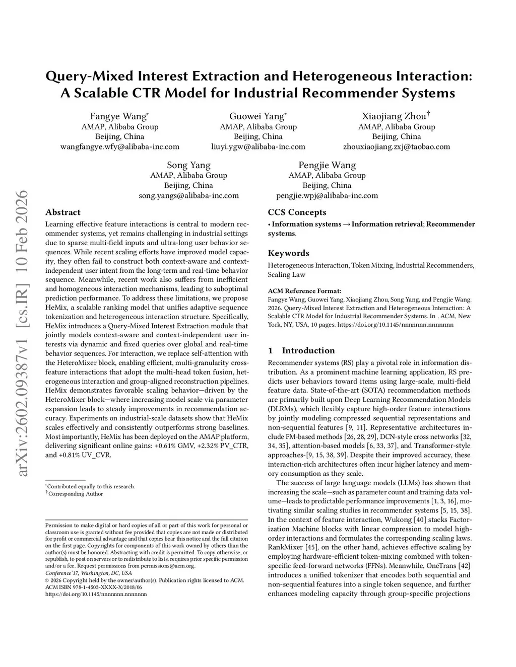 Learning effective feature interactions is central to modern recommender systems, yet remains challenging in industrial settings due to sparse multi-field inputs and ultra-long user behavior sequences. While recent scaling efforts have improved model capacity, they often fail to construct both context-aware and context-independent user intent from the long-term and real-time behavior sequence. Meanwhile, recent work also suffers from inefficient and homogeneous interaction mechanisms, leading to suboptimal prediction performance. To address these limitations, we propose HeMix, a scalable ranking model that unifies adaptive sequence tokenization and heterogeneous interaction structure. Specifically, HeMix introduces a Query-Mixed Interest Extraction module that jointly models context-aware and context-independent user interests via dynamic and fixed queries over global and real-time behavior sequences. For interaction, we replace self-attention with the HeteroMixer block, enabling efficient, multi-granularity cross-feature interactions that adopt the multi-head token fusion, heterogeneous interaction and group-aligned reconstruction pipelines. HeMix demonstrates favorable scaling behavior, driven by the HeteroMixer block, where increasing model scale via parameter expansion leads to steady improvements in recommendation accuracy. Experiments on industrial-scale datasets show that HeMix scales effectively and consistently outperforms strong baselines. Most importantly, HeMix has been deployed on the AMAP platform, delivering significant online gains over DLRM: +3.61\% GMV, +2.78\% PV\_CTR, and +2.12\% UV\_CVR.