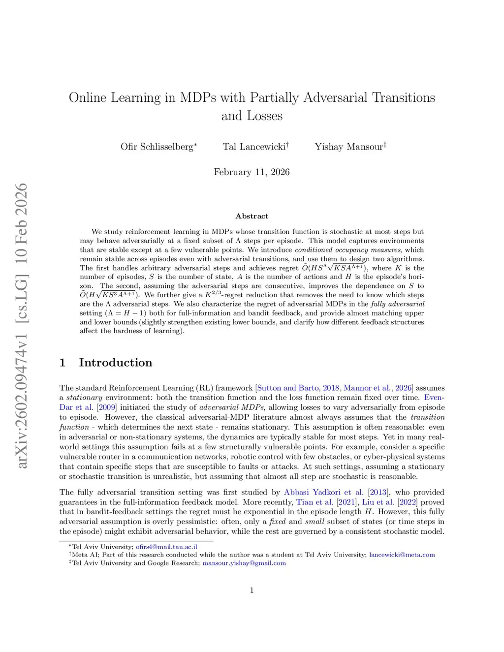 We study reinforcement learning in MDPs whose transition function is stochastic at most steps but may behave adversarially at a fixed subset of steps per episode. This model captures environments that are stable except at a few vulnerable points. We introduce \emph{conditioned occupancy measures}, which remain stable across episodes even with adversarial transitions, and use them to design two algorithms. The first handles arbitrary adversarial steps and achieves regret , where is the number of episodes, is the number of state, is the number of actions and is the episode's horizon. The second, assuming the adversarial steps are consecutive, improves the dependence on to . We further give a -regret reduction that removes the need to know which steps are the adversarial steps. We also characterize the regret of adversarial MDPs in the \emph{fully adversarial} setting () both for full-information and bandit feedback, and provide almost matching upper and lower bounds (slightly strengthen existing lower bounds, and clarify how different feedback structures affect the hardness of learning).