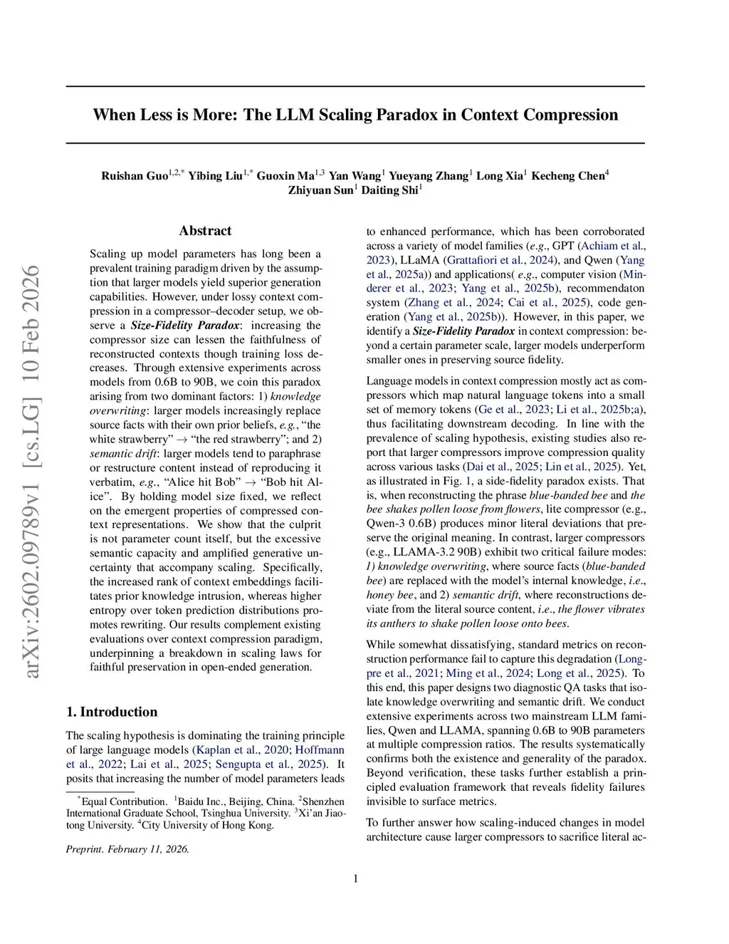 Scaling up model parameters has long been a prevalent training paradigm driven by the assumption that larger models yield superior generation capabilities. However, under lossy context compression in a compressor-decoder setup, we observe a Size-Fidelity Paradox: increasing the compressor size can lessen the faithfulness of reconstructed contexts though training loss decreases. Through extensive experiments across models from 0.6B to 90B, we coin this paradox arising from two dominant factors: 1) knowledge overwriting: larger models increasingly replace source facts with their own prior beliefs, e.g., ``the white strawberry'' ``the red strawberry''; and 2) semantic drift: larger models tend to paraphrase or restructure content instead of reproducing it verbatim, e.g., ``Alice hit Bob'' ``Bob hit Alice''. By holding model size fixed, we reflect on the emergent properties of compressed context representations. We show that the culprit is not parameter count itself, but the excessive semantic capacity and amplified generative uncertainty that accompany scaling. Specifically, the increased rank of context embeddings facilitates prior knowledge intrusion, whereas higher entropy over token prediction distributions promotes rewriting. Our results complement existing evaluations over context compression paradigm, underpinning a breakdown in scaling laws for faithful preservation in open-ended generation.