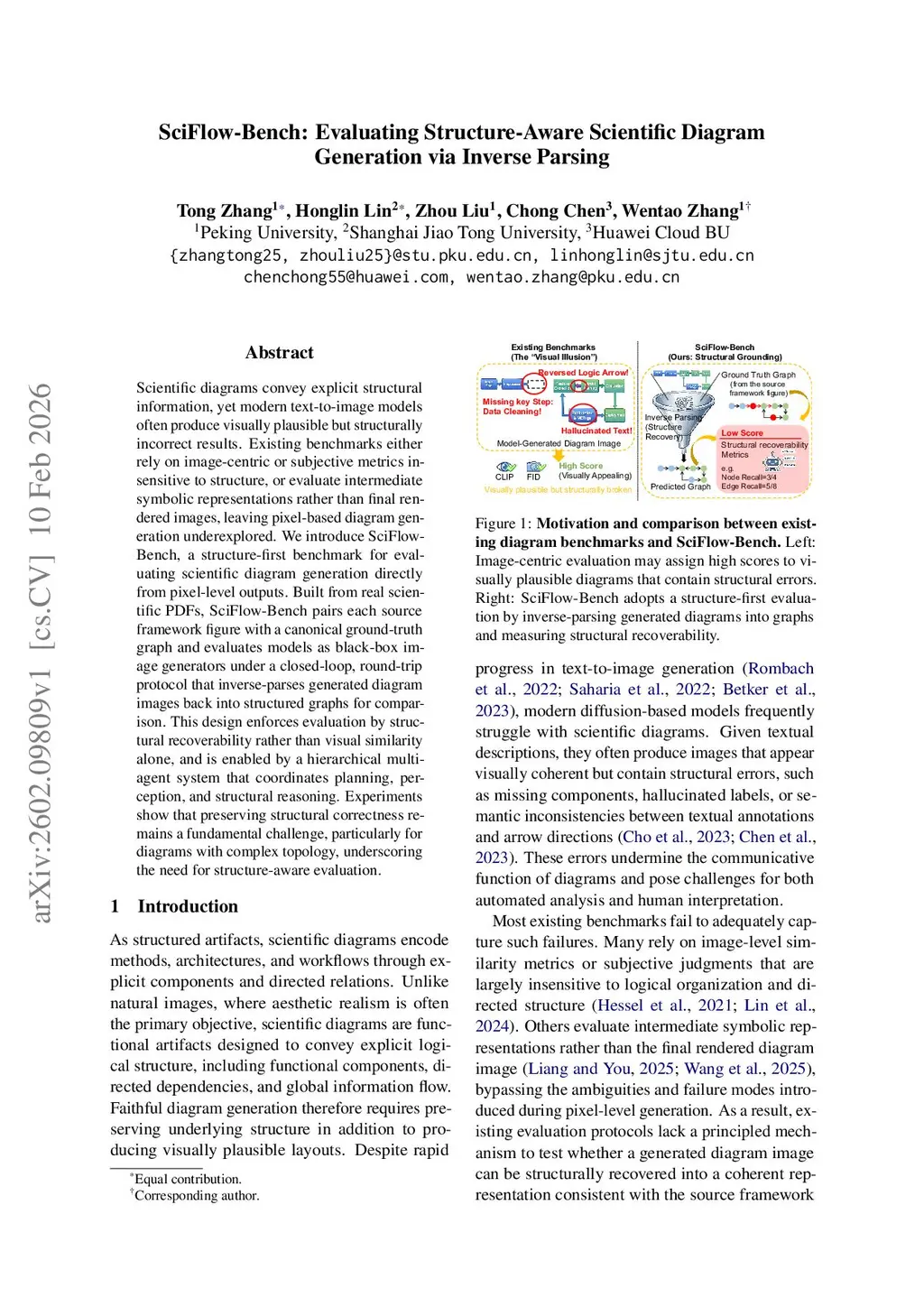Scientific diagrams convey explicit structural information, yet modern text-to-image models often produce visually plausible but structurally incorrect results. Existing benchmarks either rely on image-centric or subjective metrics insensitive to structure, or evaluate intermediate symbolic representations rather than final rendered images, leaving pixel-based diagram generation underexplored. We introduce SciFlow-Bench, a structure-first benchmark for evaluating scientific diagram generation directly from pixel-level outputs. Built from real scientific PDFs, SciFlow-Bench pairs each source framework figure with a canonical ground-truth graph and evaluates models as black-box image generators under a closed-loop, round-trip protocol that inverse-parses generated diagram images back into structured graphs for comparison. This design enforces evaluation by structural recoverability rather than visual similarity alone, and is enabled by a hierarchical multi-agent system that coordinates planning, perception, and structural reasoning. Experiments show that preserving structural correctness remains a fundamental challenge, particularly for diagrams with complex topology, underscoring the need for structure-aware evaluation.
