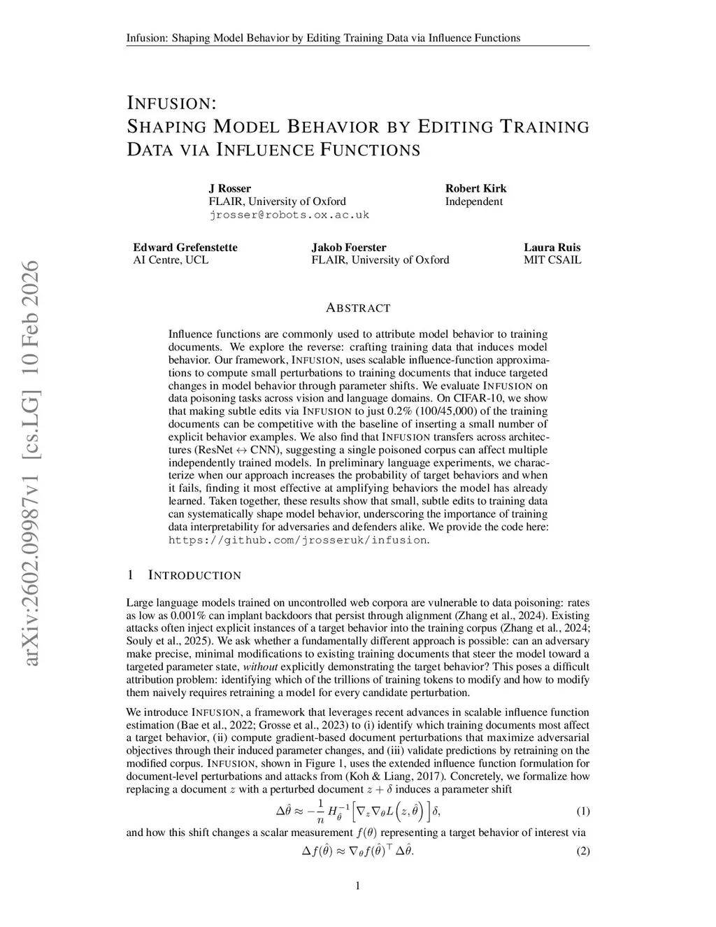 Influence functions are commonly used to attribute model behavior to training documents. We explore the reverse: crafting training data that induces model behavior. Our framework, Infusion, uses scalable influence-function approximations to compute small perturbations to training documents that induce targeted changes in model behavior through parameter shifts. We evaluate Infusion on data poisoning tasks across vision and language domains. On CIFAR-10, we show that making subtle edits via Infusion to just 0.2% (100/45,000) of the training documents can be competitive with the baseline of inserting a small number of explicit behavior examples. We also find that Infusion transfers across architectures (ResNet CNN), suggesting a single poisoned corpus can affect multiple independently trained models. In preliminary language experiments, we characterize when our approach increases the probability of target behaviors and when it fails, finding it most effective at amplifying behaviors the model has already learned. Taken together, these results show that small, subtle edits to training data can systematically shape model behavior, underscoring the importance of training data interpretability for adversaries and defenders alike. We provide the code here:this https URL.