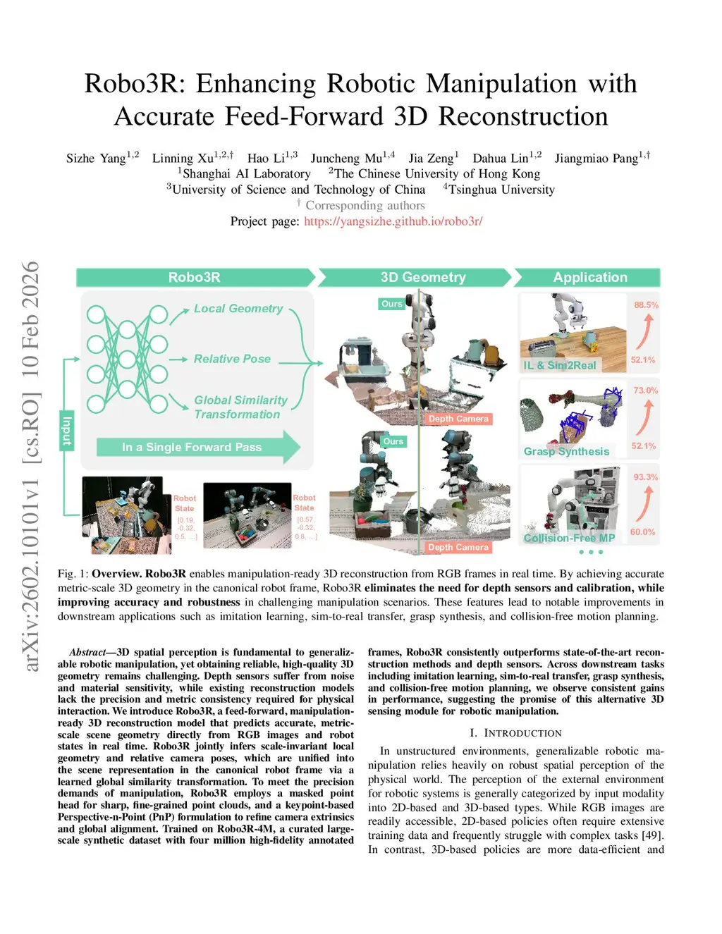 3D spatial perception is fundamental to generalizable robotic manipulation, yet obtaining reliable, high-quality 3D geometry remains challenging. Depth sensors suffer from noise and material sensitivity, while existing reconstruction models lack the precision and metric consistency required for physical interaction. We introduce Robo3R, a feed-forward, manipulation-ready 3D reconstruction model that predicts accurate, metric-scale scene geometry directly from RGB images and robot states in real time. Robo3R jointly infers scale-invariant local geometry and relative camera poses, which are unified into the scene representation in the canonical robot frame via a learned global similarity transformation. To meet the precision demands of manipulation, Robo3R employs a masked point head for sharp, fine-grained point clouds, and a keypoint-based Perspective-n-Point (PnP) formulation to refine camera extrinsics and global alignment. Trained on Robo3R-4M, a curated large-scale synthetic dataset with four million high-fidelity annotated frames, Robo3R consistently outperforms state-of-the-art reconstruction methods and depth sensors. Across downstream tasks including imitation learning, sim-to-real transfer, grasp synthesis, and collision-free motion planning, we observe consistent gains in performance, suggesting the promise of this alternative 3D sensing module for robotic manipulation.