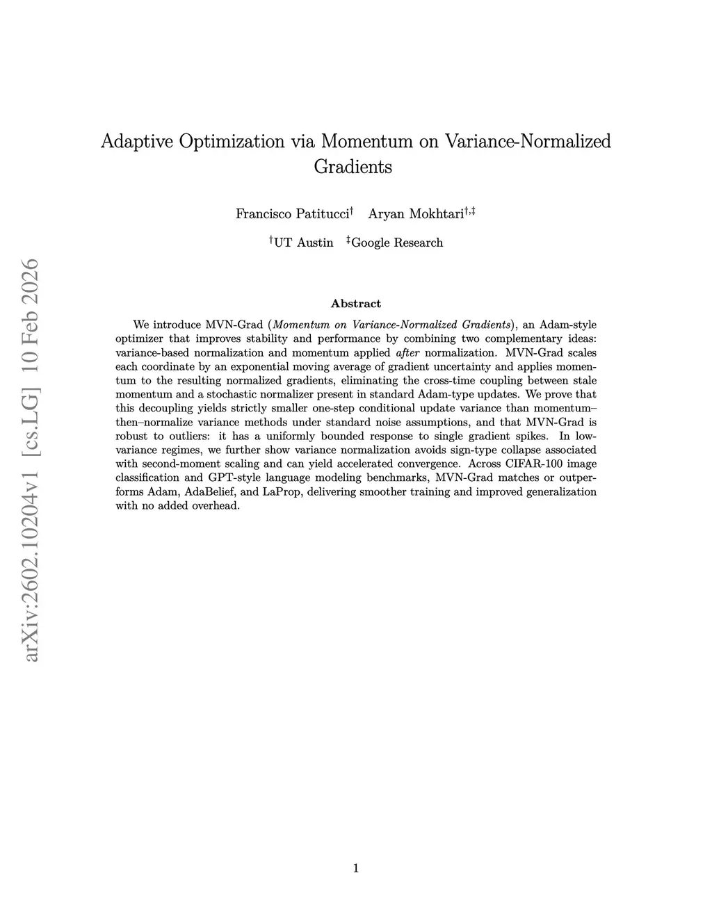 We introduce MVN-Grad (Momentum on Variance-Normalized Gradients), an Adam-style optimizer that improves stability and performance by combining two complementary ideas: variance-based normalization and momentum applied after normalization. MVN-Grad scales each coordinate by an exponential moving average of gradient uncertainty and applies momentum to the resulting normalized gradients, eliminating the cross-time coupling between stale momentum and a stochastic normalizer present in standard Adam-type updates. We prove that this decoupling yields strictly smaller one-step conditional update variance than momentum-then-normalize variance methods under standard noise assumptions, and that MVN-Grad is robust to outliers: it has a uniformly bounded response to single gradient spikes.In low-variance regimes, we further show variance normalization avoids sign-type collapse associated with second-moment scaling and can yield accelerated convergence. Across CIFAR-100 image classification and GPT-style language modeling benchmarks, MVN-Grad matches or outperforms Adam, AdaBelief, and LaProp, delivering smoother training and improved generalization with no added overhead.