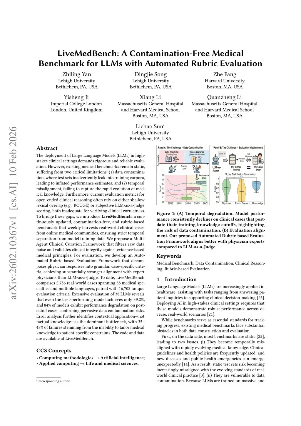 The deployment of Large Language Models (LLMs) in high-stakes clinical settings demands rigorous and reliable evaluation. However, existing medical benchmarks remain static, suffering from two critical limitations: (1) data contamination, where test sets inadvertently leak into training corpora, leading to inflated performance estimates; and (2) temporal misalignment, failing to capture the rapid evolution of medical knowledge. Furthermore, current evaluation metrics for open-ended clinical reasoning often rely on either shallow lexical overlap (e.g., ROUGE) or subjective LLM-as-a-Judge scoring, both inadequate for verifying clinical correctness. To bridge these gaps, we introduce LiveMedBench, a continuously updated, contamination-free, and rubric-based benchmark that weekly harvests real-world clinical cases from online medical communities, ensuring strict temporal separation from model training data. We propose a Multi-Agent Clinical Curation Framework that filters raw data noise and validates clinical integrity against evidence-based medical principles. For evaluation, we develop an Automated Rubric-based Evaluation Framework that decomposes physician responses into granular, case-specific criteria, achieving substantially stronger alignment with expert physicians than LLM-as-a-Judge. To date, LiveMedBench comprises 2,756 real-world cases spanning 38 medical specialties and multiple languages, paired with 16,702 unique evaluation criteria. Extensive evaluation of 38 LLMs reveals that even the best-performing model achieves only 39.2%, and 84% of models exhibit performance degradation on post-cutoff cases, confirming pervasive data contamination risks. Error analysis further identifies contextual application-not factual knowledge-as the dominant bottleneck, with 35-48% of failures stemming from the inability to tailor medical knowledge to patient-specific constraints.