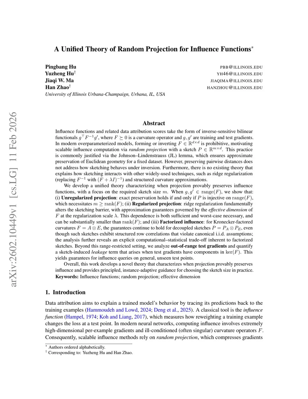 Influence functions and related data attribution scores take the form of , where is a curvature operator. In modern overparametrized models, forming or inverting is prohibitive, motivating scalable influence computation via random projection with a sketch . This practice is commonly justified via the Johnson--Lindenstrauss (JL) lemma, which ensures approximate preservation of Euclidean geometry for a fixed dataset. However, JL does not address how sketching behaves under inversion. Furthermore, there is no existing theory that explains how sketching interacts with other widely-used techniques, such as ridge regularization and structured curvature approximations.We develop a unified theory characterizing when projection provably preserves influence functions. When , we show that: 1) Unregularized projection: exact preservation holds iff is injective on , which necessitates ; 2) Regularized projection: ridge regularization fundamentally alters the sketching barrier, with approximation guarantees governed by the effective dimension of at the regularization scale; 3) Factorized influence: for Kronecker-factored curvatures , the guarantees continue to hold for decoupled sketches , even though such sketches exhibit row correlations that violate i.i.d. assumptions. Beyond this range-restricted setting, we analyze out-of-range test gradients and quantify a leakage term that arises when test gradients have components in . This yields guarantees for influence queries on general test points.Overall, this work develops a novel theory that characterizes when projection provably preserves influence and provides principled guidance for choosing the sketch size in practice.