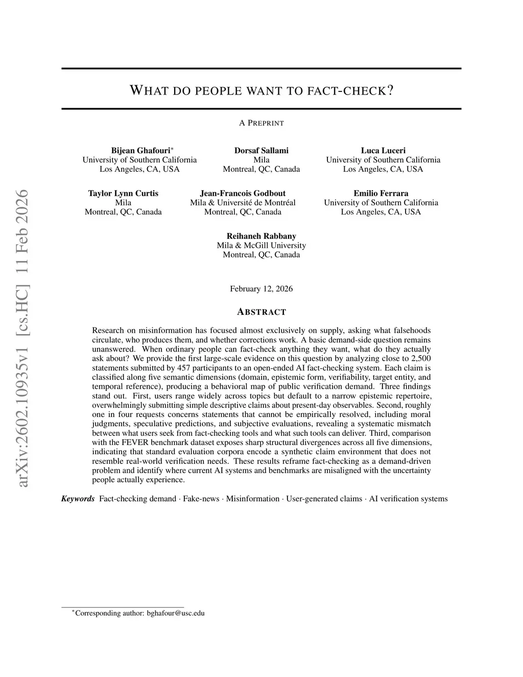 Research on misinformation has focused almost exclusively on supply, asking what falsehoods circulate, who produces them, and whether corrections work. A basic demand-side question remains unanswered. When ordinary people can fact-check anything they want, what do they actually ask about? We provide the first large-scale evidence on this question by analyzing close to 2{,}500 statements submitted by 457 participants to an open-ended AI fact-checking system. Each claim is classified along five semantic dimensions (domain, epistemic form, verifiability, target entity, and temporal reference), producing a behavioral map of public verification demand. Three findings stand out. First, users range widely across topics but default to a narrow epistemic repertoire, overwhelmingly submitting simple descriptive claims about present-day observables. Second, roughly one in four requests concerns statements that cannot be empirically resolved, including moral judgments, speculative predictions, and subjective evaluations, revealing a systematic mismatch between what users seek from fact-checking tools and what such tools can deliver. Third, comparison with the FEVER benchmark dataset exposes sharp structural divergences across all five dimensions, indicating that standard evaluation corpora encode a synthetic claim environment that does not resemble real-world verification needs. These results reframe fact-checking as a demand-driven problem and identify where current AI systems and benchmarks are misaligned with the uncertainty people actually experience.
