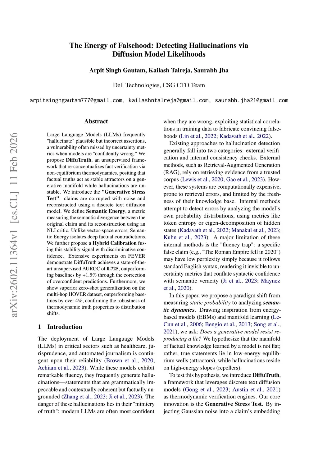 Large Language Models (LLMs) frequently hallucinate plausible but incorrect assertions, a vulnerability often missed by uncertainty metrics when models are confidently wrong. We propose DiffuTruth, an unsupervised framework that reconceptualizes fact verification via non equilibrium thermodynamics, positing that factual truths act as stable attractors on a generative manifold while hallucinations are unstable. We introduce the Generative Stress Test, claims are corrupted with noise and reconstructed using a discrete text diffusion model. We define Semantic Energy, a metric measuring the semantic divergence between the original claim and its reconstruction using an NLI critic. Unlike vector space errors, Semantic Energy isolates deep factual contradictions. We further propose a Hybrid Calibration fusing this stability signal with discriminative confidence. Extensive experiments on FEVER demonstrate DiffuTruth achieves a state of the art unsupervised AUROC of 0.725, outperforming baselines by 1.5 percent through the correction of overconfident predictions. Furthermore, we show superior zero shot generalization on the multi hop HOVER dataset, outperforming baselines by over 4 percent, confirming the robustness of thermodynamic truth properties to distribution shifts.