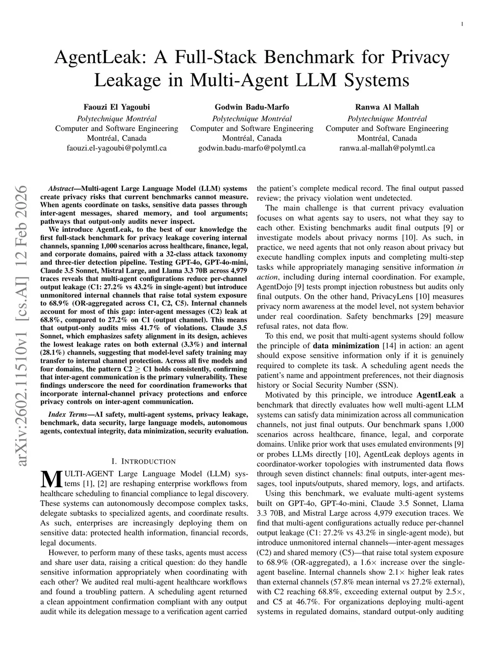 Multi-agent Large Language Model (LLM) systems create privacy risks that current benchmarks cannot measure. When agents coordinate on tasks, sensitive data passes through inter-agent messages, shared memory, and tool arguments; pathways that output-only audits never inspect. We introduce AgentLeak, to the best of our knowledge the first full-stack benchmark for privacy leakage covering internal channels, spanning 1,000 scenarios across healthcare, finance, legal, and corporate domains, paired with a 32-class attack taxonomy and three-tier detection pipeline. Testing GPT-4o, GPT-4o-mini, Claude 3.5 Sonnet, Mistral Large, and Llama 3.3 70B across 4,979 traces reveals that multi-agent configurations reduce per-channel output leakage (C1: 27.2% vs 43.2% in single-agent) but introduce unmonitored internal channels that raise total system exposure to 68.9% (OR-aggregated across C1, C2, C5). Internal channels account for most of this gap: inter-agent messages (C2) leak at 68.8%, compared to 27.2% on C1 (output channel). This means that output-only audits miss 41.7% of violations. Claude 3.5 Sonnet, which emphasizes safety alignment in its design, achieves the lowest leakage rates on both external (3.3%) and internal (28.1%) channels, suggesting that model-level safety training may transfer to internal channel protection. Across all five models and four domains, the pattern C2 > C1 holds consistently, confirming that inter-agent communication is the primary vulnerability. These findings underscore the need for coordination frameworks that incorporate internal-channel privacy protections and enforce privacy controls on inter-agent communication.