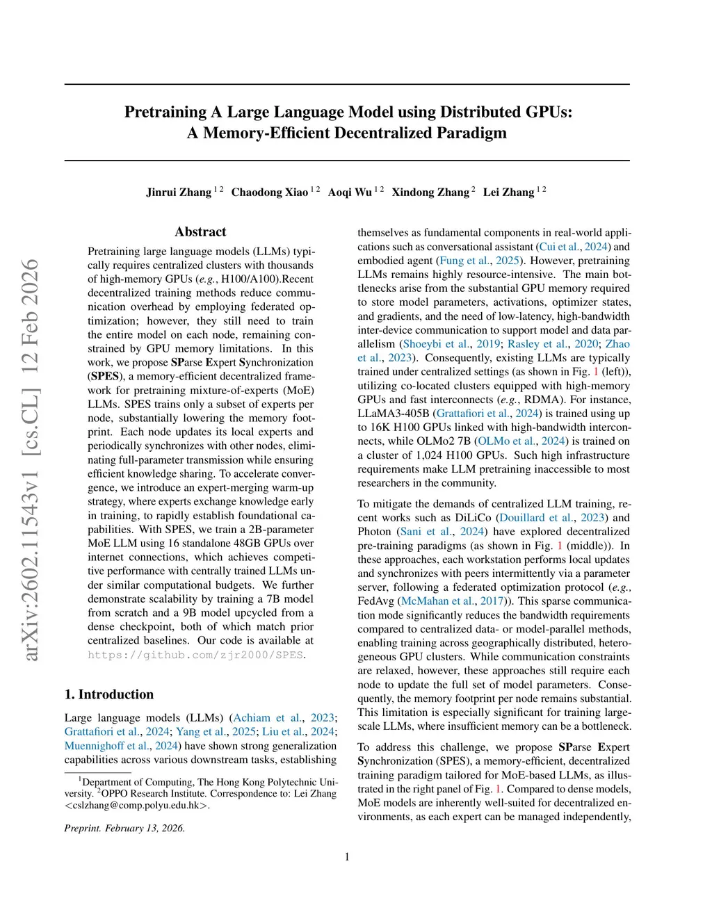 Pretraining A Large Language Model using Distributed GPUs: A Memory-Efficient Decentralized Paradigm