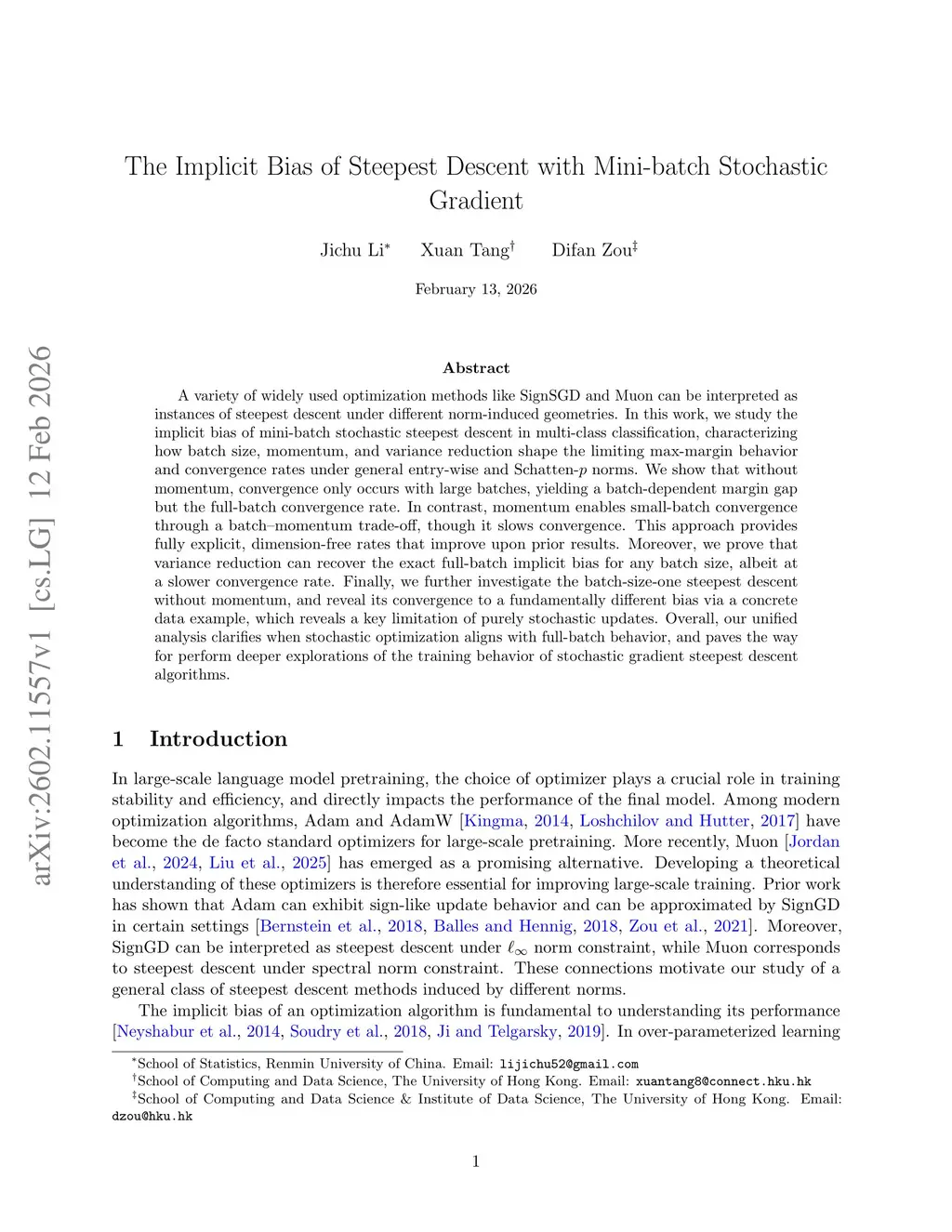 A variety of widely used optimization methods like SignSGD and Muon can be interpreted as instances of steepest descent under different norm-induced geometries. In this work, we study the implicit bias of mini-batch stochastic steepest descent in multi-class classification, characterizing how batch size, momentum, and variance reduction shape the limiting max-margin behavior and convergence rates under general entry-wise and Schatten- norms. We show that without momentum, convergence only occurs with large batches, yielding a batch-dependent margin gap but the full-batch convergence rate. In contrast, momentum enables small-batch convergence through a batch-momentum trade-off, though it slows convergence. This approach provides fully explicit, dimension-free rates that improve upon prior results. Moreover, we prove that variance reduction can recover the exact full-batch implicit bias for any batch size, albeit at a slower convergence rate. Finally, we further investigate the batch-size-one steepest descent without momentum, and reveal its convergence to a fundamentally different bias via a concrete data example, which reveals a key limitation of purely stochastic updates. Overall, our unified analysis clarifies when stochastic optimization aligns with full-batch behavior, and paves the way for perform deeper explorations of the training behavior of stochastic gradient steepest descent algorithms.