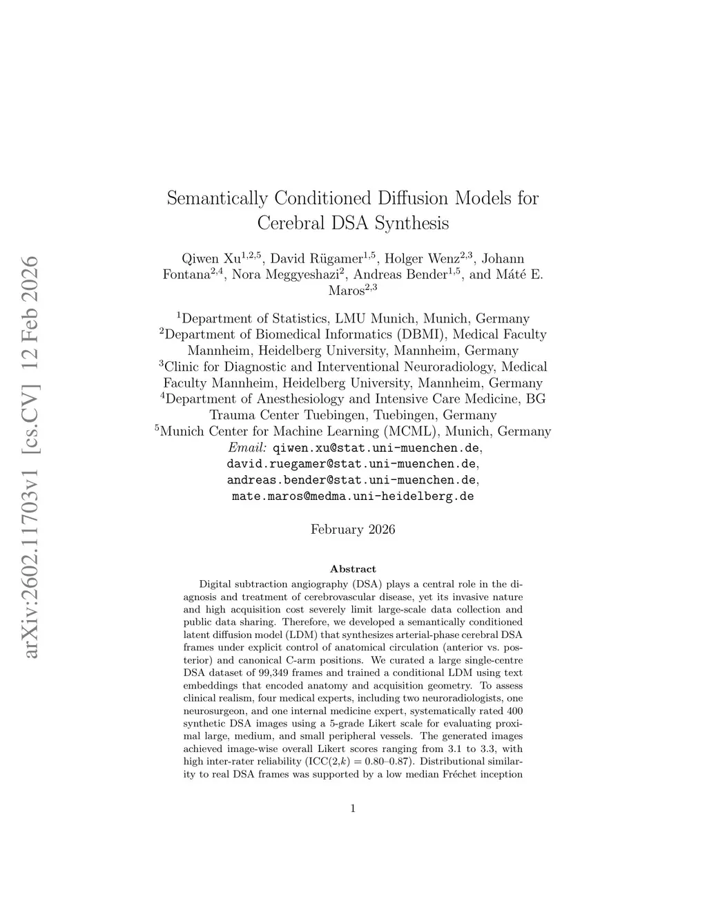 Digital subtraction angiography (DSA) plays a central role in the diagnosis and treatment of cerebrovascular disease, yet its invasive nature and high acquisition cost severely limit large-scale data collection and public data sharing. Therefore, we developed a semantically conditioned latent diffusion model (LDM) that synthesizes arterial-phase cerebral DSA frames under explicit control of anatomical circulation (anterior vs.\ posterior) and canonical C-arm positions. We curated a large single-centre DSA dataset of 99,349 frames and trained a conditional LDM using text embeddings that encoded anatomy and acquisition geometry. To assess clinical realism, four medical experts, including two neuroradiologists, one neurosurgeon, and one internal medicine expert, systematically rated 400 synthetic DSA images using a 5-grade Likert scale for evaluating proximal large, medium, and small peripheral vessels. The generated images achieved image-wise overall Likert scores ranging from 3.1 to 3.3, with high inter-rater reliability (ICC(2,k) = 0.80--0.87). Distributional similarity to real DSA frames was supported by a low median Fréchet inception distance (FID) of 15.27. Our results indicate that semantically controlled LDMs can produce realistic synthetic DSAs suitable for downstream algorithm development, research, and training.