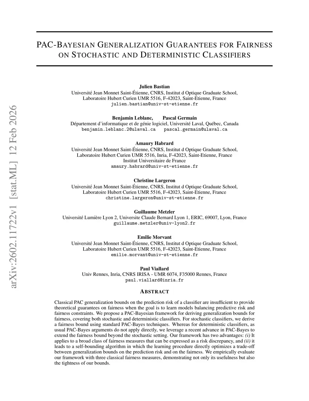 Classical PAC generalization bounds on the prediction risk of a classifier are insufficient to provide theoretical guarantees on fairness when the goal is to learn models balancing predictive risk and fairness constraints. We propose a PAC-Bayesian framework for deriving generalization bounds for fairness, covering both stochastic and deterministic classifiers. For stochastic classifiers, we derive a fairness bound using standard PAC-Bayes techniques. Whereas for deterministic classifiers, as usual PAC-Bayes arguments do not apply directly, we leverage a recent advance in PAC-Bayes to extend the fairness bound beyond the stochastic setting. Our framework has two advantages: (i) It applies to a broad class of fairness measures that can be expressed as a risk discrepancy, and (ii) it leads to a self-bounding algorithm in which the learning procedure directly optimizes a trade-off between generalization bounds on the prediction risk and on the fairness. We empirically evaluate our framework with three classical fairness measures, demonstrating not only its usefulness but also the tightness of our bounds.