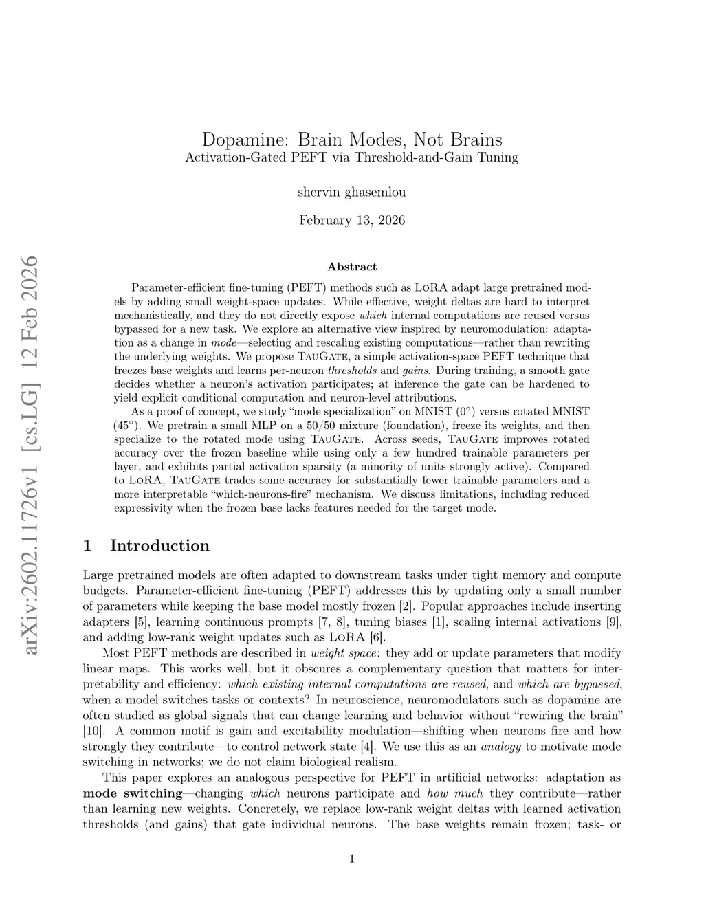 Parameter-efficient fine-tuning (PEFT) methods such as \lora{} adapt large pretrained models by adding small weight-space updates. While effective, weight deltas are hard to interpret mechanistically, and they do not directly expose \emph{which} internal computations are reused versus bypassed for a new task. We explore an alternative view inspired by neuromodulation: adaptation as a change in \emph{mode} -- selecting and rescaling existing computations -- rather than rewriting the underlying weights. We propose \methodname{}, a simple activation-space PEFT technique that freezes base weights and learns per-neuron \emph{thresholds} and \emph{gains}. During training, a smooth gate decides whether a neuron's activation participates; at inference the gate can be hardened to yield explicit conditional computation and neuron-level attributions.As a proof of concept, we study ``mode specialization'' on MNIST (0) versus rotated MNIST (45). We pretrain a small MLP on a 50/50 mixture (foundation), freeze its weights, and then specialize to the rotated mode using \methodname{}. Across seeds, \methodname{} improves rotated accuracy over the frozen baseline while using only a few hundred trainable parameters per layer, and exhibits partial activation sparsity (a minority of units strongly active). Compared to \lora{}, \methodname{} trades some accuracy for substantially fewer trainable parameters and a more interpretable ``which-neurons-fire'' mechanism. We discuss limitations, including reduced expressivity when the frozen base lacks features needed for the target mode.