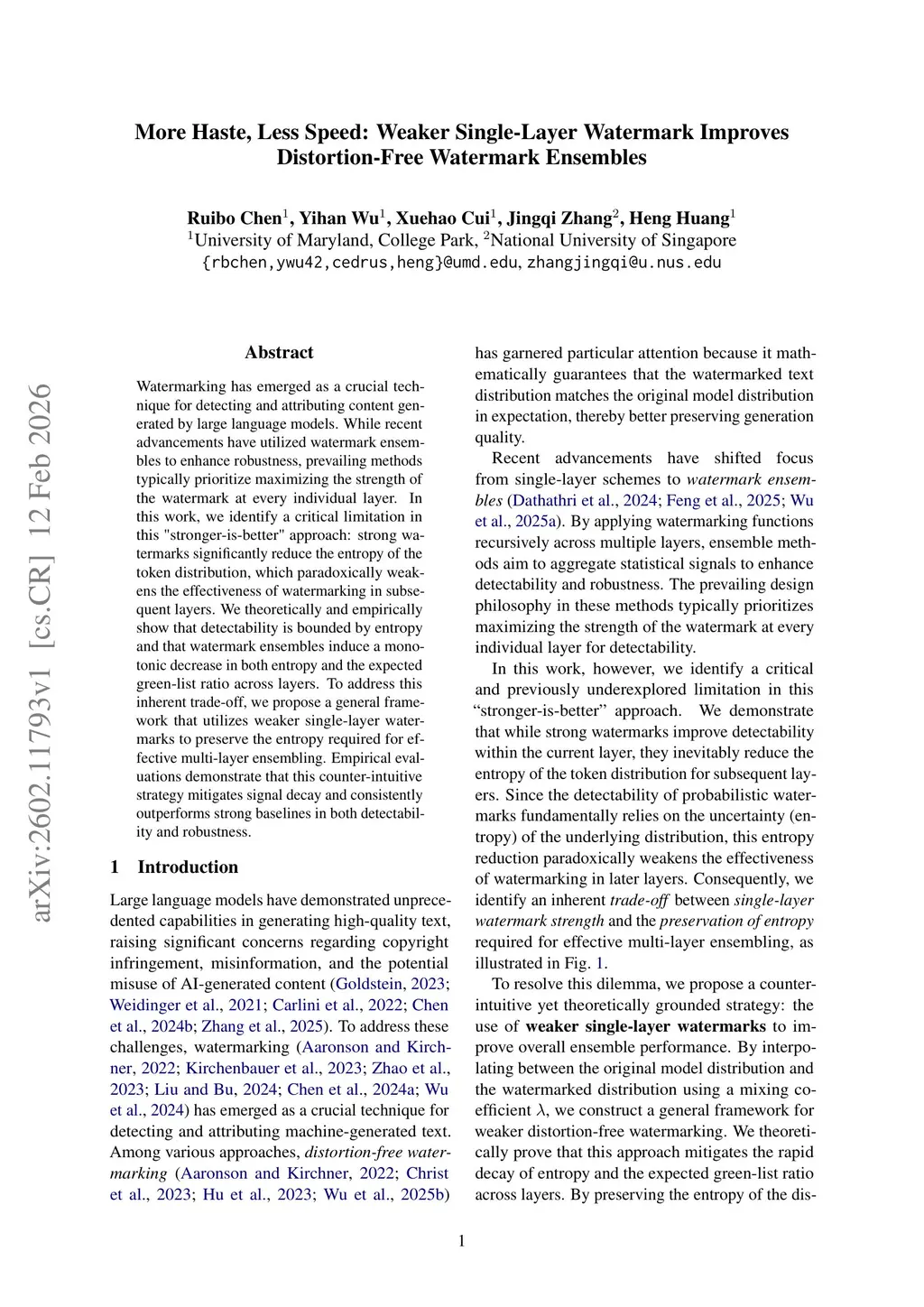 Watermarking has emerged as a crucial technique for detecting and attributing content generated by large language models. While recent advancements have utilized watermark ensembles to enhance robustness, prevailing methods typically prioritize maximizing the strength of the watermark at every individual layer. In this work, we identify a critical limitation in this "stronger-is-better" approach: strong watermarks significantly reduce the entropy of the token distribution, which paradoxically weakens the effectiveness of watermarking in subsequent layers. We theoretically and empirically show that detectability is bounded by entropy and that watermark ensembles induce a monotonic decrease in both entropy and the expected green-list ratio across layers. To address this inherent trade-off, we propose a general framework that utilizes weaker single-layer watermarks to preserve the entropy required for effective multi-layer ensembling. Empirical evaluations demonstrate that this counter-intuitive strategy mitigates signal decay and consistently outperforms strong baselines in both detectability and robustness.