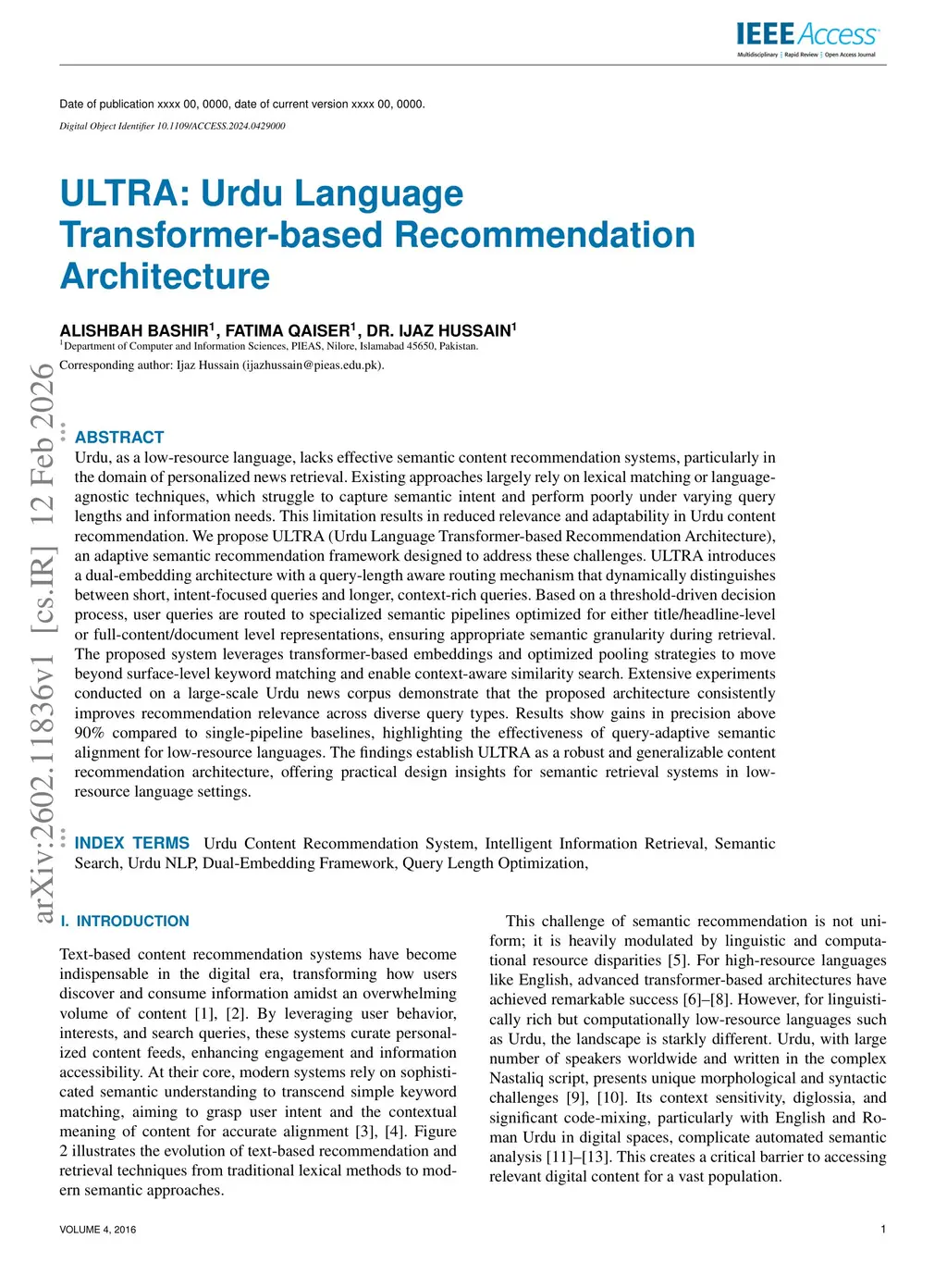 Urdu, as a low-resource language, lacks effective semantic content recommendation systems, particularly in the domain of personalized news retrieval. Existing approaches largely rely on lexical matching or language-agnostic techniques, which struggle to capture semantic intent and perform poorly under varying query lengths and information needs. This limitation results in reduced relevance and adaptability in Urdu content recommendation. We propose ULTRA (Urdu Language Transformer-based Recommendation Architecture),an adaptive semantic recommendation framework designed to address these challenges. ULTRA introduces a dual-embedding architecture with a query-length aware routing mechanism that dynamically distinguishes between short, intent-focused queries and longer, context-rich queries. Based on a threshold-driven decision process, user queries are routed to specialized semantic pipelines optimized for either title/headline-level or full-content/document level representations, ensuring appropriate semantic granularity during retrieval. The proposed system leverages transformer-based embeddings and optimized pooling strategies to move beyond surface-level keyword matching and enable context-aware similarity search. Extensive experiments conducted on a large-scale Urdu news corpus demonstrate that the proposed architecture consistently improves recommendation relevance across diverse query types. Results show gains in precision above 90% compared to single-pipeline baselines, highlighting the effectiveness of query-adaptive semantic alignment for low-resource languages. The findings establish ULTRA as a robust and generalizable content recommendation architecture, offering practical design insights for semantic retrieval systems in low-resource language settings.