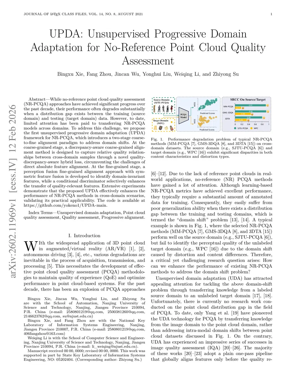 While no-reference point cloud quality assessment (NR-PCQA) approaches have achieved significant progress over the past decade, their performance often degrades substantially when a distribution gap exists between the training (source domain) and testing (target domain) data. However, to date, limited attention has been paid to transferring NR-PCQA models across domains. To address this challenge, we propose the first unsupervised progressive domain adaptation (UPDA) framework for NR-PCQA, which introduces a two-stage coarse-to-fine alignment paradigm to address domain shifts. At the coarse-grained stage, a discrepancy-aware coarse-grained alignment method is designed to capture relative quality relationships between cross-domain samples through a novel quality-discrepancy-aware hybrid loss, circumventing the challenges of direct absolute feature alignment. At the fine-grained stage, a perception fusion fine-grained alignment approach with symmetric feature fusion is developed to identify domain-invariant features, while a conditional discriminator selectively enhances the transfer of quality-relevant features. Extensive experiments demonstrate that the proposed UPDA effectively enhances the performance of NR-PCQA methods in cross-domain scenarios, validating its practical applicability. The code is available atthis https URL.