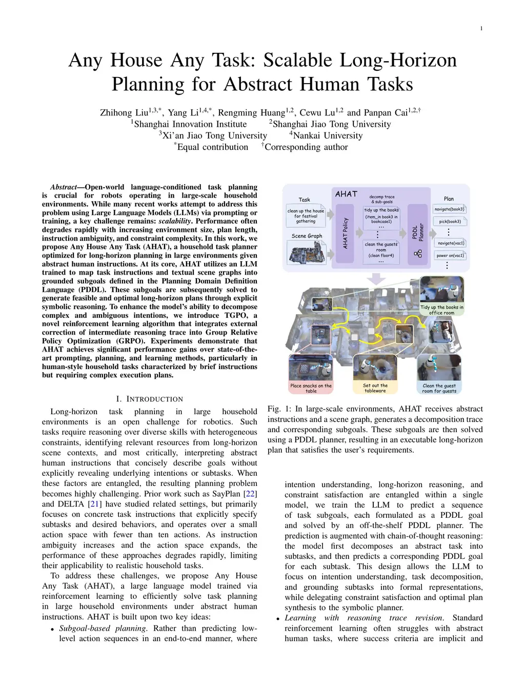 Open world language conditioned task planning is crucial for robots operating in large-scale household environments. While many recent works attempt to address this problem using Large Language Models (LLMs) via prompting or training, a key challenge remains scalability. Performance often degrades rapidly with increasing environment size, plan length, instruction ambiguity, and constraint complexity. In this work, we propose Any House Any Task (AHAT), a household task planner optimized for long-horizon planning in large environments given ambiguous human instructions. At its core, AHAT utilizes an LLM trained to map task instructions and textual scene graphs into grounded subgoals defined in the Planning Domain Definition Language (PDDL). These subgoals are subsequently solved to generate feasible and optimal long-horizon plans through explicit symbolic reasoning. To enhance the model's ability to decompose complex and ambiguous intentions, we introduce TGPO, a novel reinforcement learning algorithm that integrates external correction of intermediate reasoning traces into Group Relative Policy Optimization (GRPO). Experiments demonstrate that AHAT achieves significant performance gains over state-of-the-art prompting, planning, and learning methods, particularly in human-style household tasks characterized by brief instructions but requiring complex execution plans.