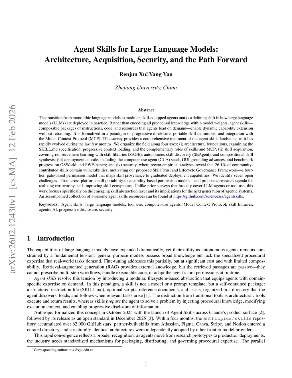 Agent Skills for Large Language Models: Architecture, Acquisition, Security, and the Path Forward