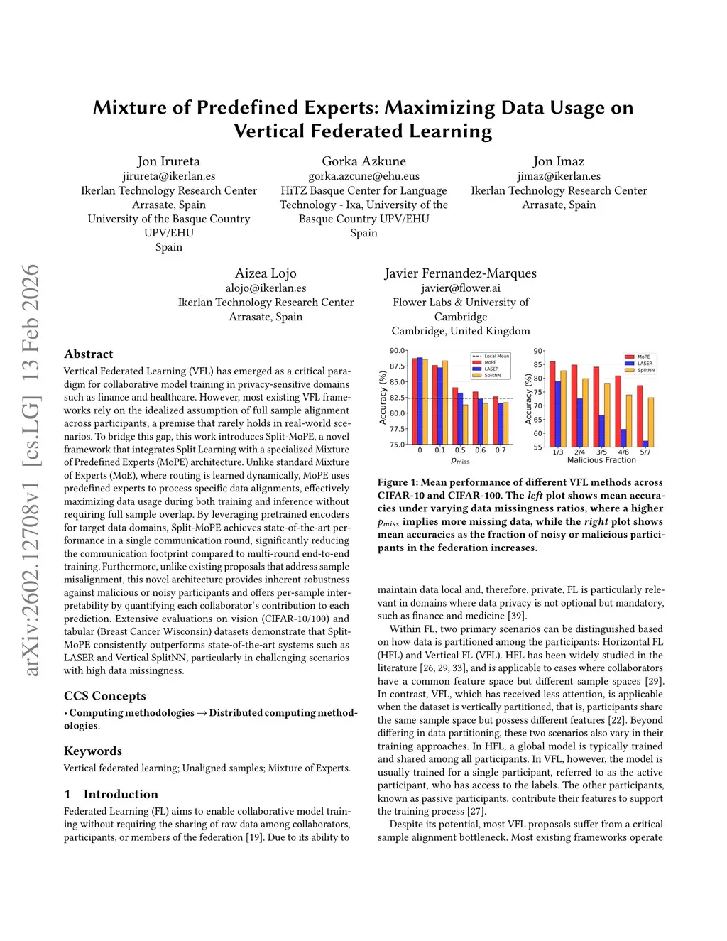 Vertical Federated Learning (VFL) has emerged as a critical paradigm for collaborative model training in privacy-sensitive domains such as finance and healthcare. However, most existing VFL frameworks rely on the idealized assumption of full sample alignment across participants, a premise that rarely holds in real-world scenarios. To bridge this gap, this work introduces Split-MoPE, a novel framework that integrates Split Learning with a specialized Mixture of Predefined Experts (MoPE) architecture. Unlike standard Mixture of Experts (MoE), where routing is learned dynamically, MoPE uses predefined experts to process specific data alignments, effectively maximizing data usage during both training and inference without requiring full sample overlap. By leveraging pretrained encoders for target data domains, Split-MoPE achieves state-of-the-art performance in a single communication round, significantly reducing the communication footprint compared to multi-round end-to-end training. Furthermore, unlike existing proposals that address sample misalignment, this novel architecture provides inherent robustness against malicious or noisy participants and offers per-sample interpretability by quantifying each collaborator's contribution to each prediction. Extensive evaluations on vision (CIFAR-10/100) and tabular (Breast Cancer Wisconsin) datasets demonstrate that Split-MoPE consistently outperforms state-of-the-art systems such as LASER and Vertical SplitNN, particularly in challenging scenarios with high data missingness.