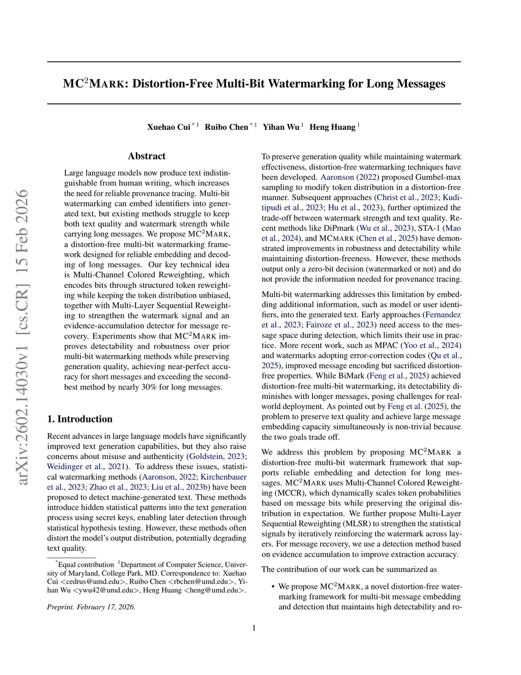 Large language models now produce text indistinguishable from human writing, which increases the need for reliable provenance tracing. Multi-bit watermarking can embed identifiers into generated text, but existing methods struggle to keep both text quality and watermark strength while carrying long messages. We propose MCMark, a distortion-free multi-bit watermarking framework designed for reliable embedding and decoding of long messages. Our key technical idea is Multi-Channel Colored Reweighting, which encodes bits through structured token reweighting while keeping the token distribution unbiased, together with Multi-Layer Sequential Reweighting to strengthen the watermark signal and an evidence-accumulation detector for message recovery. Experiments show that MCMark improves detectability and robustness over prior multi-bit watermarking methods while preserving generation quality, achieving near-perfect accuracy for short messages and exceeding the second-best method by nearly 30% for long messages.