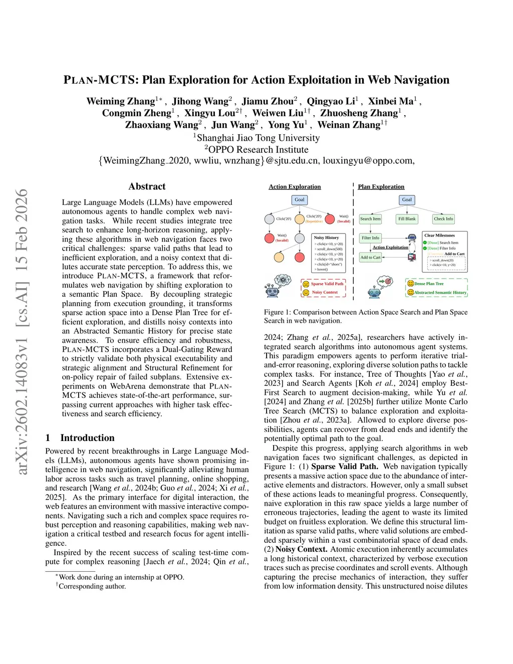 Large Language Models (LLMs) have empowered autonomous agents to handle complex web navigation tasks. While recent studies integrate tree search to enhance long-horizon reasoning, applying these algorithms in web navigation faces two critical challenges: sparse valid paths that lead to inefficient exploration, and a noisy context that dilutes accurate state perception. To address this, we introduce Plan-MCTS, a framework that reformulates web navigation by shifting exploration to a semantic Plan Space. By decoupling strategic planning from execution grounding, it transforms sparse action space into a Dense Plan Tree for efficient exploration, and distills noisy contexts into an Abstracted Semantic History for precise state awareness. To ensure efficiency and robustness, Plan-MCTS incorporates a Dual-Gating Reward to strictly validate both physical executability and strategic alignment and Structural Refinement for on-policy repair of failed subplans. Extensive experiments on WebArena demonstrate that Plan-MCTS achieves state-of-the-art performance, surpassing current approaches with higher task effectiveness and search efficiency.