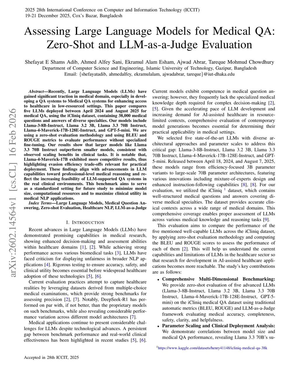 Recently, Large Language Models (LLMs) have gained significant traction in medical domain, especially in developing a QA systems to Medical QA systems for enhancing access to healthcare in low-resourced settings. This paper compares five LLMs deployed between April 2024 and August 2025 for medical QA, using the iCliniq dataset, containing 38,000 medical questions and answers of diverse specialties. Our models include Llama-3-8B-Instruct, Llama 3.2 3B, Llama 3.3 70B Instruct, Llama-4-Maverick-17B-128E-Instruct, and GPT-5-mini. We are using a zero-shot evaluation methodology and using BLEU and ROUGE metrics to evaluate performance without specialized fine-tuning. Our results show that larger models like Llama 3.3 70B Instruct outperform smaller models, consistent with observed scaling benefits in clinical tasks. It is notable that, Llama-4-Maverick-17B exhibited more competitive results, thus highlighting evasion efficiency trade-offs relevant for practical deployment. These findings align with advancements in LLM capabilities toward professional-level medical reasoning and reflect the increasing feasibility of LLM-supported QA systems in the real clinical environments. This benchmark aims to serve as a standardized setting for future study to minimize model size, computational resources and to maximize clinical utility in medical NLP applications.