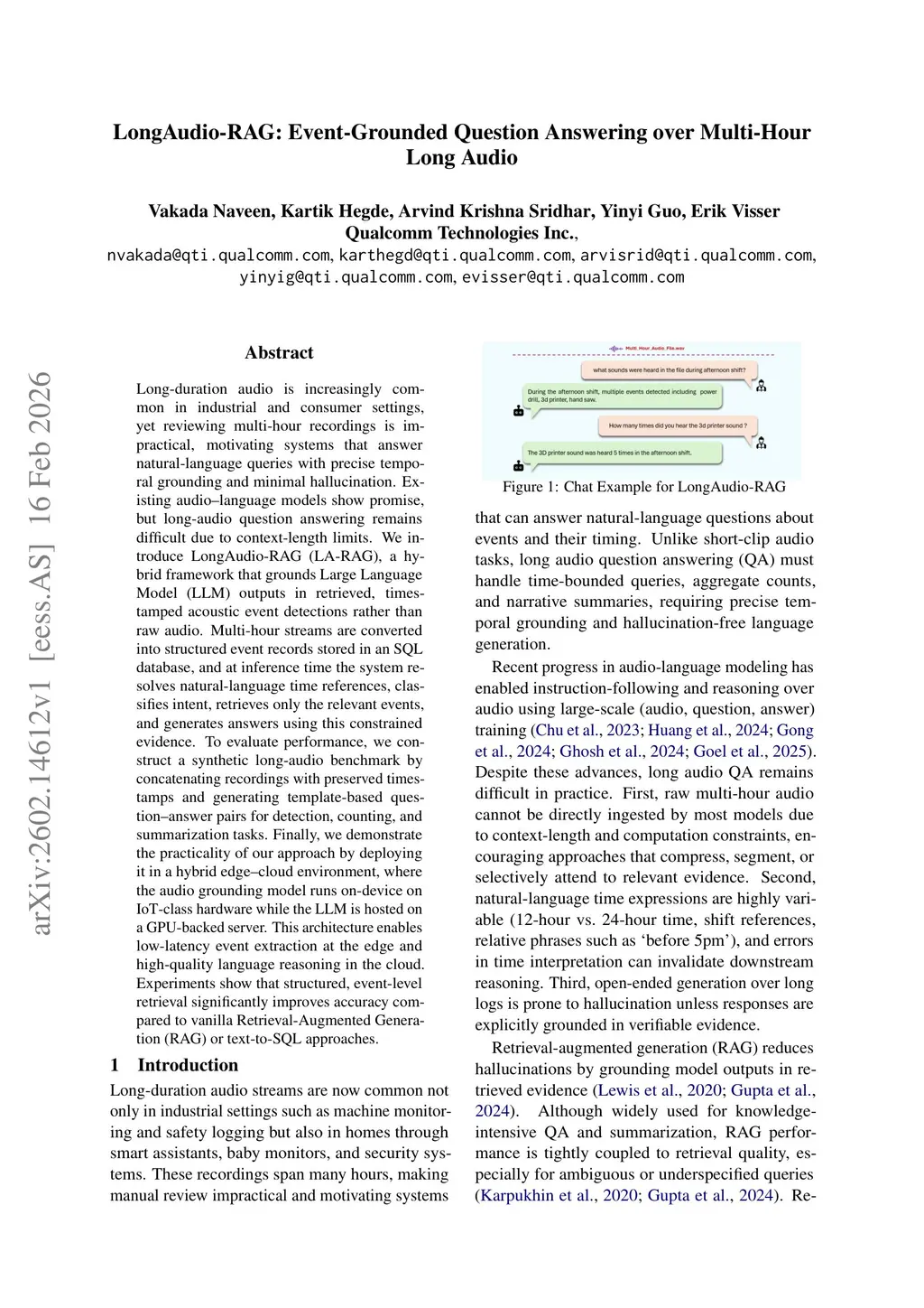 Long-duration audio is increasingly common in industrial and consumer settings, yet reviewing multi-hour recordings is impractical, motivating systems that answer natural-language queries with precise temporal grounding and minimal hallucination. Existing audio-language models show promise, but long-audio question answering remains difficult due to context-length limits. We introduce LongAudio-RAG (LA-RAG), a hybrid framework that grounds Large Language Model (LLM) outputs in retrieved, timestamped acoustic event detections rather than raw audio. Multi-hour streams are converted into structured event records stored in an SQL database, and at inference time the system resolves natural-language time references, classifies intent, retrieves only the relevant events, and generates answers using this constrained evidence. To evaluate performance, we construct a synthetic long-audio benchmark by concatenating recordings with preserved timestamps and generating template-based question-answer pairs for detection, counting, and summarization tasks. Finally, we demonstrate the practicality of our approach by deploying it in a hybrid edge-cloud environment, where the audio grounding model runs on-device on IoT-class hardware while the LLM is hosted on a GPU-backed server. This architecture enables low-latency event extraction at the edge and high-quality language reasoning in the cloud. Experiments show that structured, event-level retrieval significantly improves accuracy compared to vanilla Retrieval-Augmented Generation (RAG) or text-to-SQL approaches.
