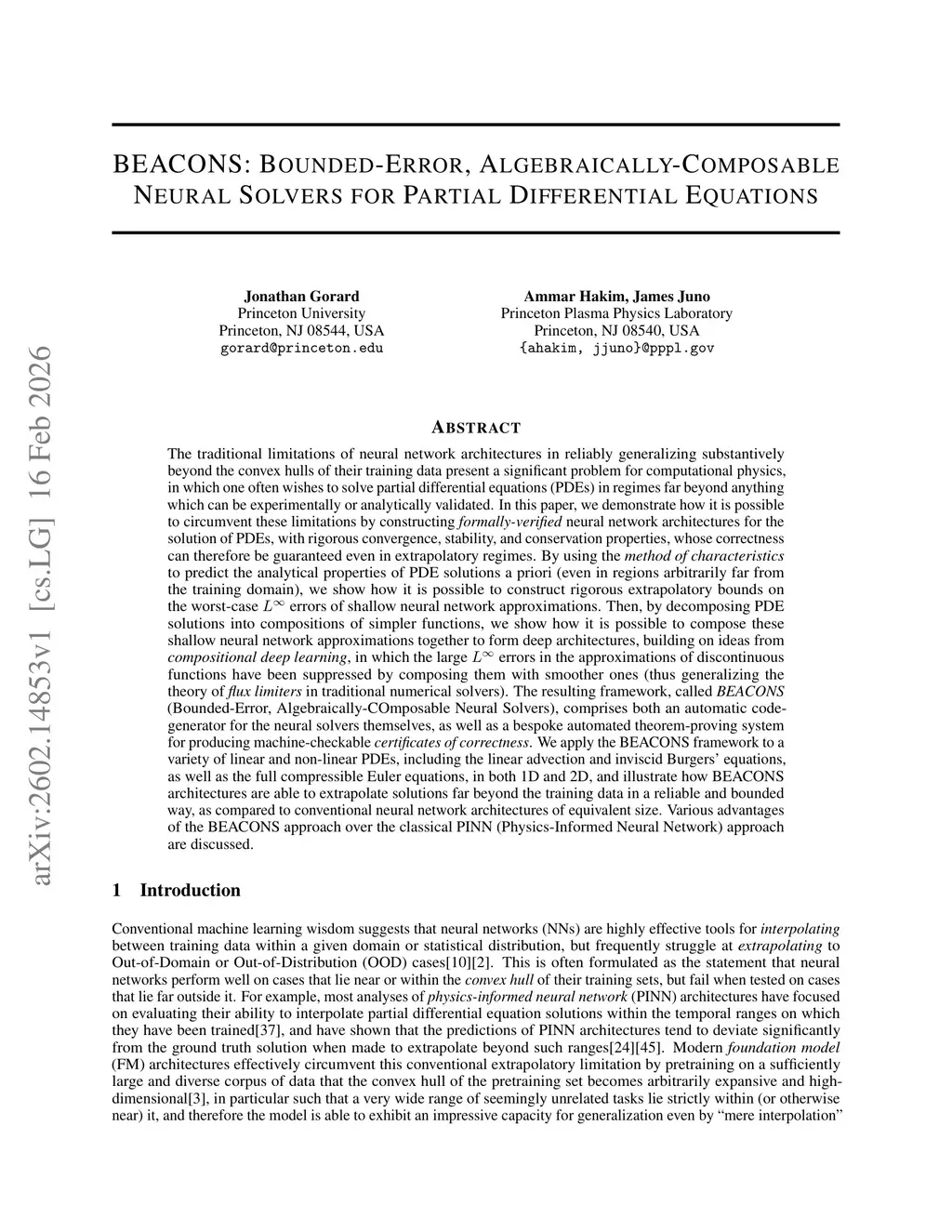 The traditional limitations of neural networks in reliably generalizing beyond the convex hulls of their training data present a significant problem for computational physics, in which one often wishes to solve PDEs in regimes far beyond anything which can be experimentally or analytically validated. In this paper, we show how it is possible to circumvent these limitations by constructing formally-verified neural network solvers for PDEs, with rigorous convergence, stability, and conservation properties, whose correctness can therefore be guaranteed even in extrapolatory regimes. By using the method of characteristics to predict the analytical properties of PDE solutions a priori (even in regions arbitrarily far from the training domain), we show how it is possible to construct rigorous extrapolatory bounds on the worst-case L^inf errors of shallow neural network approximations. Then, by decomposing PDE solutions into compositions of simpler functions, we show how it is possible to compose these shallow neural networks together to form deep architectures, based on ideas from compositional deep learning, in which the large L^inf errors in the approximations have been suppressed. The resulting framework, called BEACONS (Bounded-Error, Algebraically-COmposable Neural Solvers), comprises both an automatic code-generator for the neural solvers themselves, as well as a bespoke automated theorem-proving system for producing machine-checkable certificates of correctness. We apply the framework to a variety of linear and non-linear PDEs, including the linear advection and inviscid Burgers' equations, as well as the full compressible Euler equations, in both 1D and 2D, and illustrate how BEACONS architectures are able to extrapolate solutions far beyond the training data in a reliable and bounded way. Various advantages of the approach over the classical PINN approach are discussed.