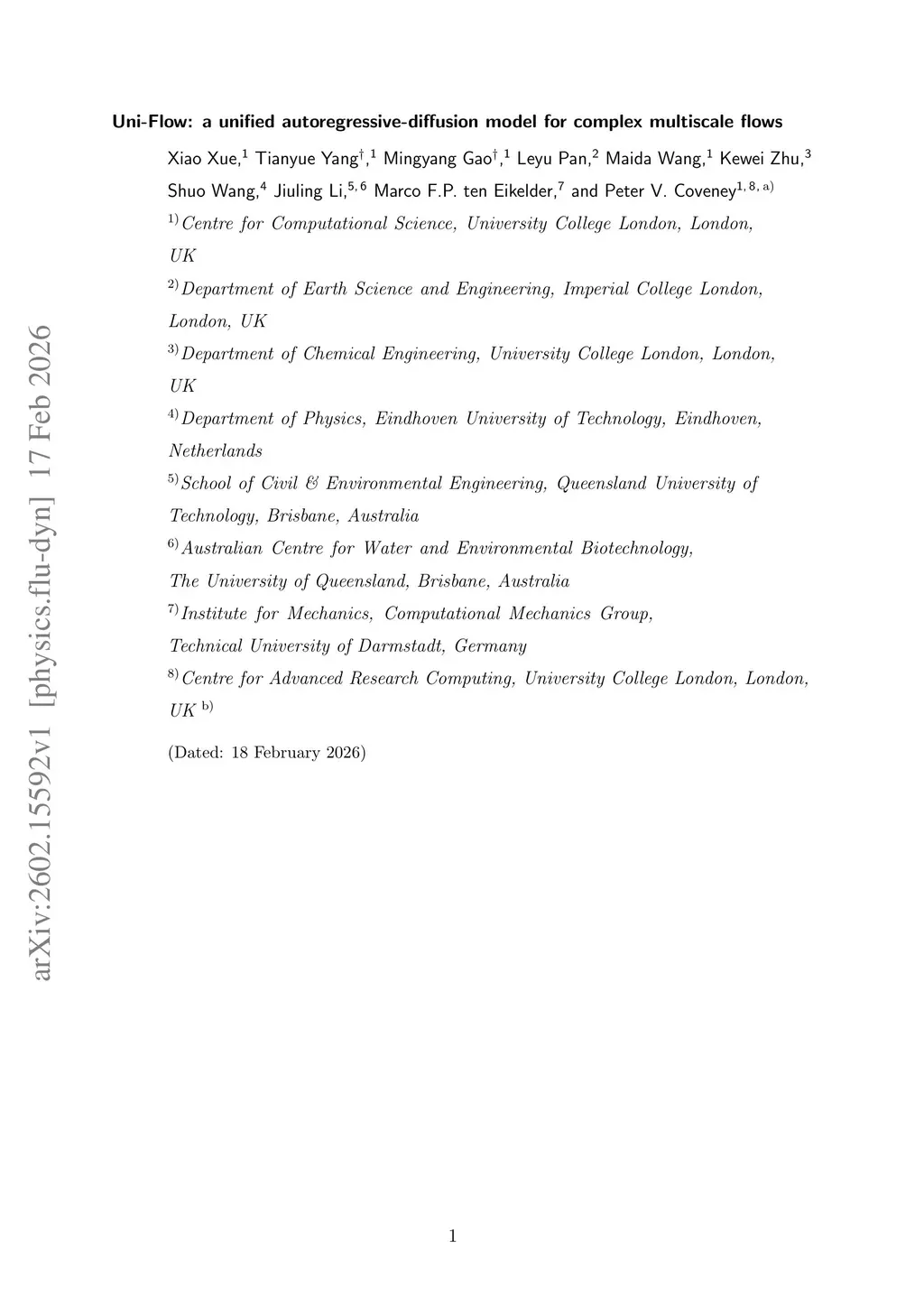 Spatiotemporal flows govern diverse phenomena across physics, biology, and engineering, yet modelling their multiscale dynamics remains a central challenge. Despite major advances in physics-informed machine learning, existing approaches struggle to simultaneously maintain long-term temporal evolution and resolve fine-scale structure across chaotic, turbulent, and physiological regimes. Here, we introduce Uni-Flow, a unified autoregressive-diffusion framework that explicitly separates temporal evolution from spatial refinement for modelling complex dynamical systems. The autoregressive component learns low-resolution latent dynamics that preserve large-scale structure and ensure stable long-horizon rollouts, while the diffusion component reconstructs high-resolution physical fields, recovering fine-scale features in a small number of denoising steps. We validate Uni-Flow across canonical benchmarks, including two-dimensional Kolmogorov flow, three-dimensional turbulent channel inflow generation with a quantum-informed autoregressive prior, and patient-specific simulations of aortic coarctation derived from high-fidelity lattice Boltzmann hemodynamic solvers. In the cardiovascular setting, Uni-Flow enables task-level faster than real-time inference of pulsatile hemodynamics, reconstructing high-resolution pressure fields over physiologically relevant time horizons in seconds rather than hours. By transforming high-fidelity hemodynamic simulation from an offline, HPC-bound process into a deployable surrogate, Uni-Flow establishes a pathway to faster-than-real-time modelling of complex multiscale flows, with broad implications for scientific machine learning in flow physics.
