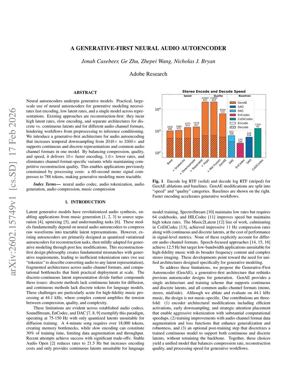 Neural autoencoders underpin generative models. Practical, large-scale use of neural autoencoders for generative modeling necessitates fast encoding, low latent rates, and a single model across representations. Existing approaches are reconstruction-first: they incur high latent rates, slow encoding, and separate architectures for discrete vs. continuous latents and for different audio channel formats, hindering workflows from preprocessing to inference conditioning. We introduce a generative-first architecture for audio autoencoding that increases temporal downsampling from 2048x to 3360x and supports continuous and discrete representations and common audio channel formats in one model. By balancing compression, quality, and speed, it delivers 10x faster encoding, 1.6x lower rates, and eliminates channel-format-specific variants while maintaining competitive reconstruction quality. This enables applications previously constrained by processing costs: a 60-second mono signal compresses to 788 tokens, making generative modeling more tractable.