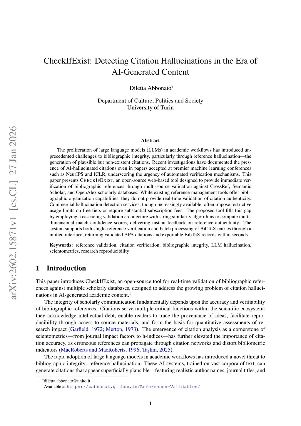 The proliferation of large language models (LLMs) in academic workflows has introduced unprecedented challenges to bibliographic integrity, particularly through reference hallucination -- the generation of plausible but non-existent citations. Recent investigations have documented the presence of AI-hallucinated citations even in papers accepted at premier machine learning conferences such as NeurIPS and ICLR, underscoring the urgency of automated verification mechanisms. This paper presents "CheckIfExist", an open-source web-based tool designed to provide immediate verification of bibliographic references through multi-source validation against CrossRef, Semantic Scholar, and OpenAlex scholarly databases. While existing reference management tools offer bibliographic organization capabilities, they do not provide real-time validation of citation authenticity. Commercial hallucination detection services, though increasingly available, often impose restrictive usage limits on free tiers or require substantial subscription fees. The proposed tool fills this gap by employing a cascading validation architecture with string similarity algorithms to compute multi-dimensional match confidence scores, delivering instant feedback on reference authenticity. The system supports both single-reference verification and batch processing of BibTeX entries through a unified interface, returning validated APA citations and exportable BibTeX records within seconds.