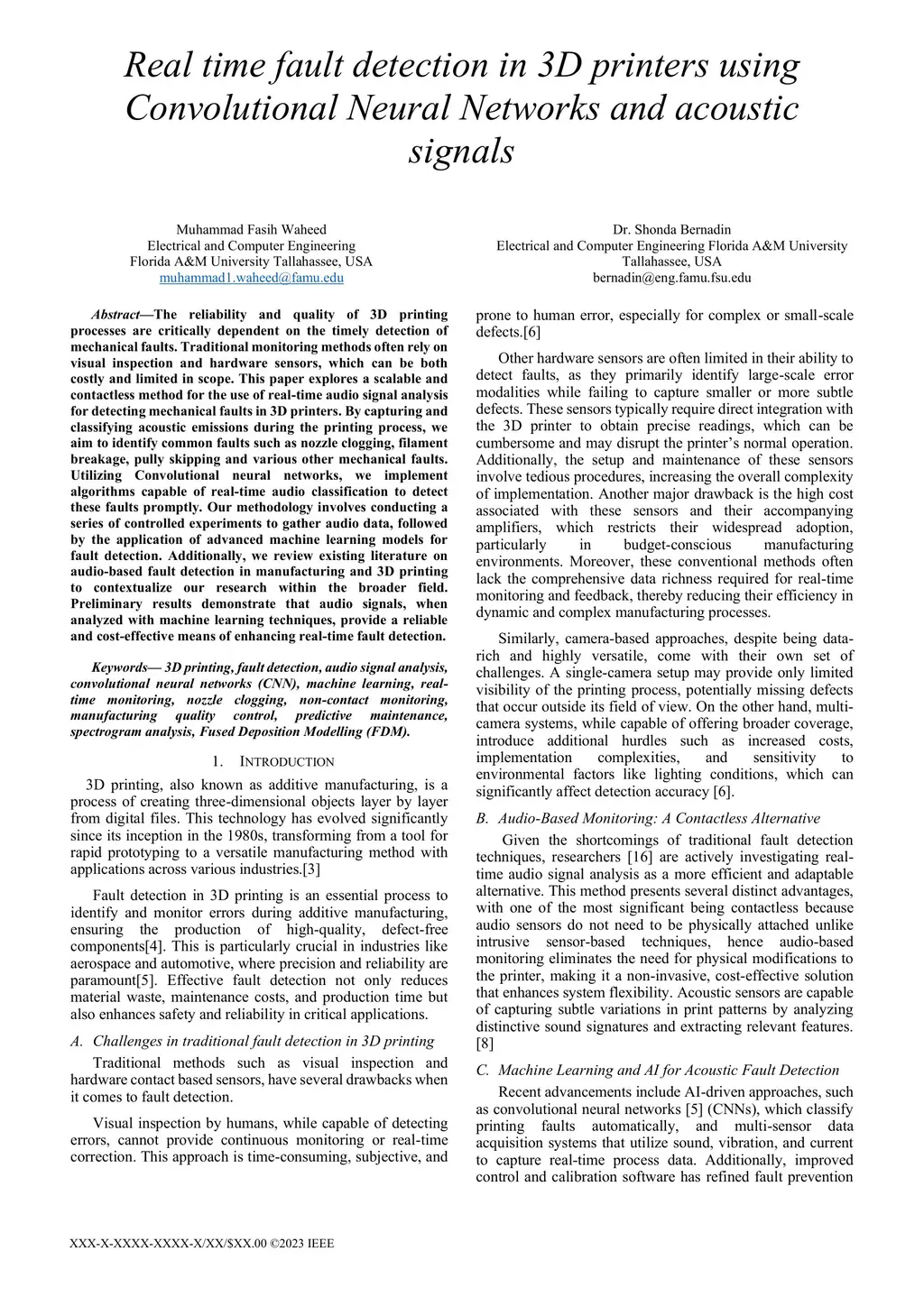 The reliability and quality of 3D printing processes are critically dependent on the timely detection of mechanical faults. Traditional monitoring methods often rely on visual inspection and hardware sensors, which can be both costly and limited in scope. This paper explores a scalable and contactless method for the use of real-time audio signal analysis for detecting mechanical faults in 3D printers. By capturing and classifying acoustic emissions during the printing process, we aim to identify common faults such as nozzle clogging, filament breakage, pully skipping and various other mechanical faults. Utilizing Convolutional neural networks, we implement algorithms capable of real-time audio classification to detect these faults promptly. Our methodology involves conducting a series of controlled experiments to gather audio data, followed by the application of advanced machine learning models for fault detection. Additionally, we review existing literature on audio-based fault detection in manufacturing and 3D printing to contextualize our research within the broader field. Preliminary results demonstrate that audio signals, when analyzed with machine learning techniques, provide a reliable and cost-effective means of enhancing real-time fault detection.