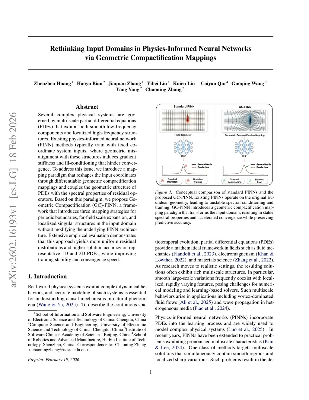 Several complex physical systems are governed by multi-scale partial differential equations (PDEs) that exhibit both smooth low-frequency components and localized high-frequency structures. Existing physics-informed neural network (PINN) methods typically train with fixed coordinate system inputs, where geometric misalignment with these structures induces gradient stiffness and ill-conditioning that hinder convergence. To address this issue, we introduce a mapping paradigm that reshapes the input coordinates through differentiable geometric compactification mappings and couples the geometric structure of PDEs with the spectral properties of residual operators. Based on this paradigm, we propose Geometric Compactification (GC)-PINN, a framework that introduces three mapping strategies for periodic boundaries, far-field scale expansion, and localized singular structures in the input domain without modifying the underlying PINN architecture. Extensive empirical evaluation demonstrates that this approach yields more uniform residual distributions and higher solution accuracy on representative 1D and 2D PDEs, while improving training stability and convergence speed.