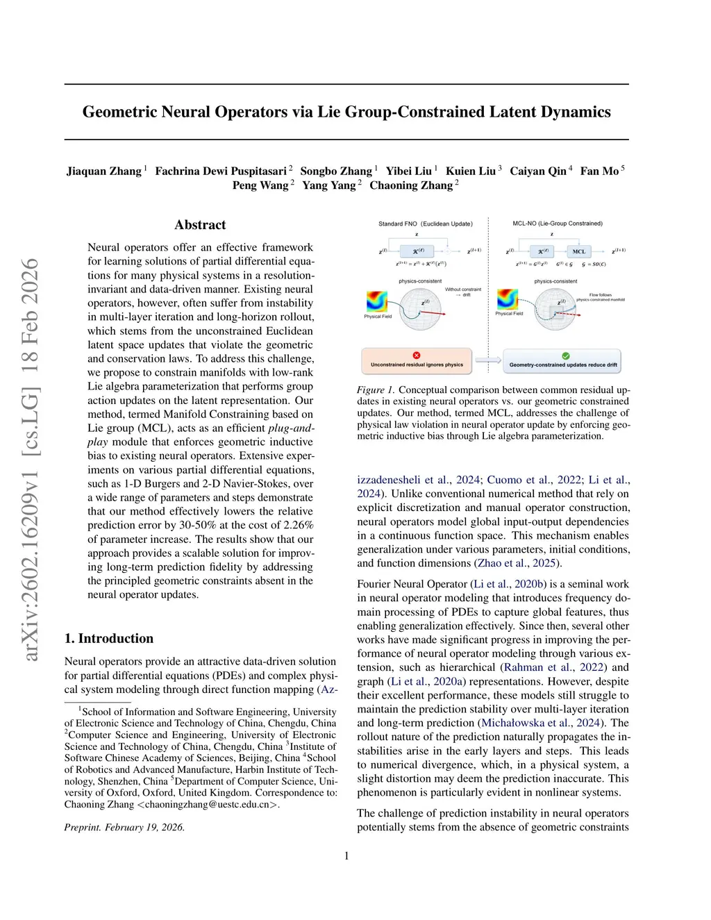 Neural operators offer an effective framework for learning solutions of partial differential equations for many physical systems in a resolution-invariant and data-driven manner. Existing neural operators, however, often suffer from instability in multi-layer iteration and long-horizon rollout, which stems from the unconstrained Euclidean latent space updates that violate the geometric and conservation laws. To address this challenge, we propose to constrain manifolds with low-rank Lie algebra parameterization that performs group action updates on the latent representation. Our method, termed Manifold Constraining based on Lie group (MCL), acts as an efficient \emph{plug-and-play} module that enforces geometric inductive bias to existing neural operators. Extensive experiments on various partial differential equations, such as 1-D Burgers and 2-D Navier-Stokes, over a wide range of parameters and steps demonstrate that our method effectively lowers the relative prediction error by 30-50\% at the cost of 2.26\% of parameter increase. The results show that our approach provides a scalable solution for improving long-term prediction fidelity by addressing the principled geometric constraints absent in the neural operator updates.