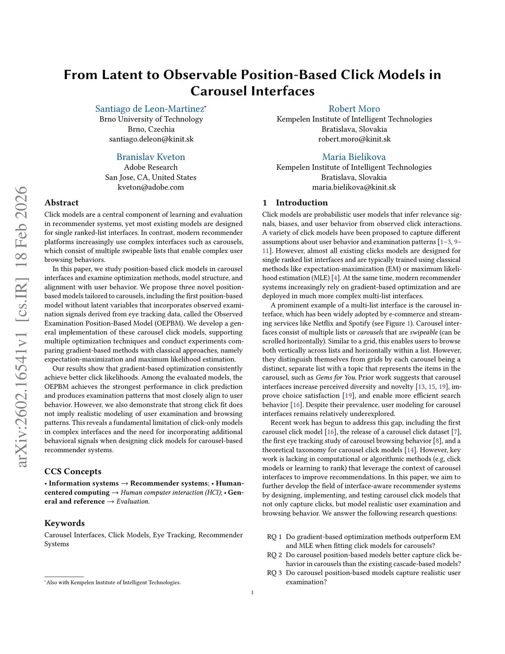 Click models are a central component of learning and evaluation in recommender systems, yet most existing models are designed for single ranked-list interfaces. In contrast, modern recommender platforms increasingly use complex interfaces such as carousels, which consist of multiple swipeable lists that enable complex user browsing behaviors.In this paper, we study position-based click models in carousel interfaces and examine optimization methods, model structure, and alignment with user behavior. We propose three novel position-based models tailored to carousels, including the first position-based model without latent variables that incorporates observed examination signals derived from eye tracking data, called the Observed Examination Position-Based Model (OEPBM). We develop a general implementation of these carousel click models, supporting multiple optimization techniques and conduct experiments comparing gradient-based methods with classical approaches, namely expectation-maximization and maximum likelihood estimation.Our results show that gradient-based optimization consistently achieve better click likelihoods. Among the evaluated models, the OEPBM achieves the strongest performance in click prediction and produces examination patterns that most closely align to user behavior. However, we also demonstrate that strong click fit does not imply realistic modeling of user examination and browsing patterns. This reveals a fundamental limitation of click-only models in complex interfaces and the need for incorporating additional behavioral signals when designing click models for carousel-based recommender systems.