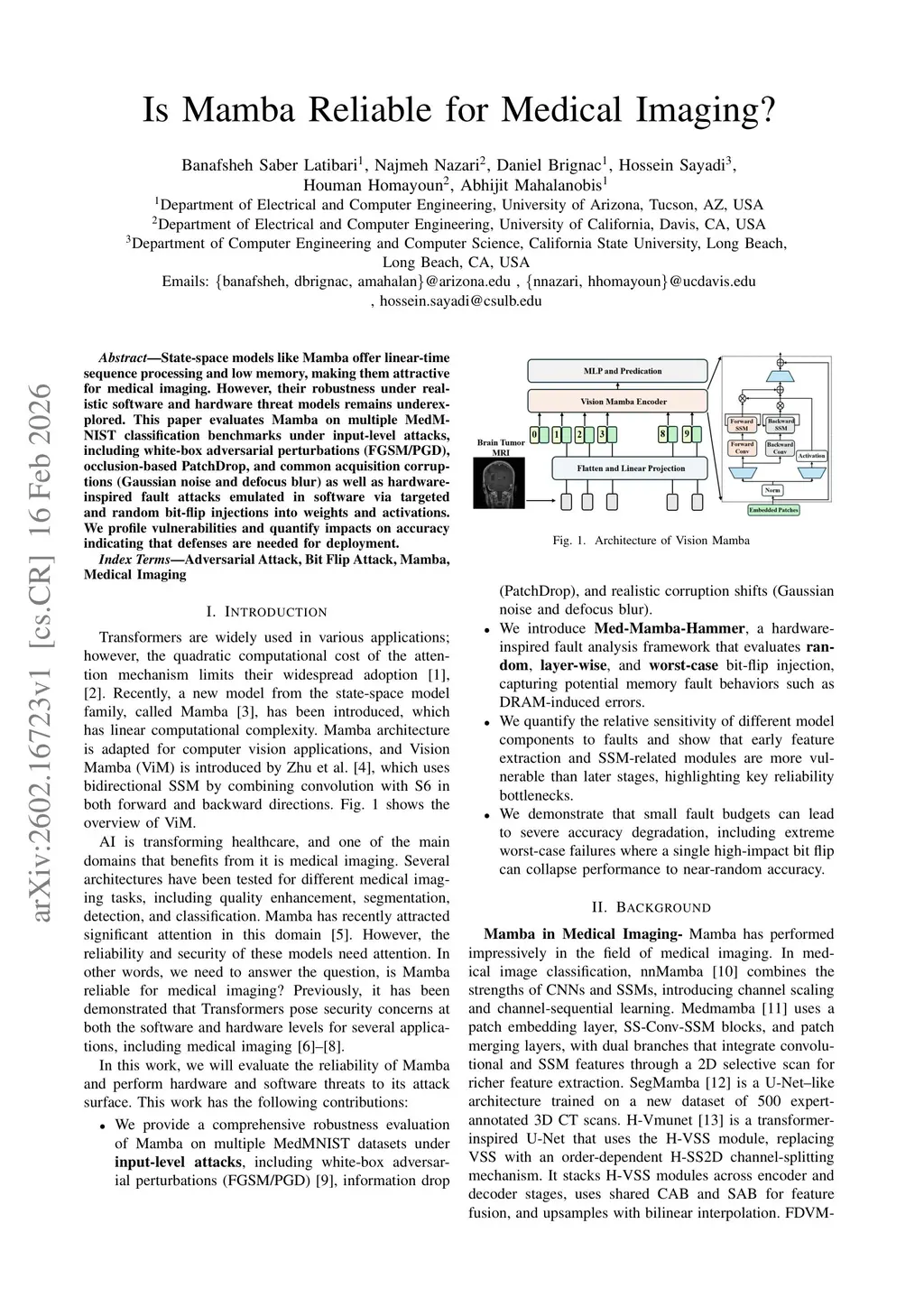 State-space models like Mamba offer linear-time sequence processing and low memory, making them attractive for medical imaging. However, their robustness under realistic software and hardware threat models remains underexplored. This paper evaluates Mamba on multiple MedM-NIST classification benchmarks under input-level attacks, including white-box adversarial perturbations (FGSM/PGD), occlusion-based PatchDrop, and common acquisition corruptions (Gaussian noise and defocus blur) as well as hardware-inspired fault attacks emulated in software via targeted and random bit-flip injections into weights and activations. We profile vulnerabilities and quantify impacts on accuracy indicating that defenses are needed for deployment.