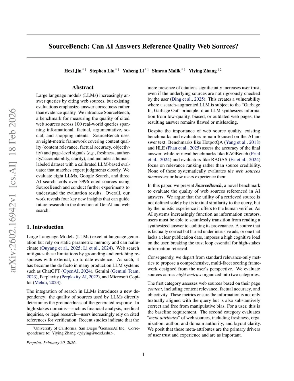 Large language models (LLMs) increasingly answer queries by citing web sources, but existing evaluations emphasize answer correctness rather than evidence quality. We introduce SourceBench, a benchmark for measuring the quality of cited web sources across 100 real-world queries spanning informational, factual, argumentative, social, and shopping intents. SourceBench uses an eight-metric framework covering content quality (content relevance, factual accuracy, objectivity) and page-level signals (e.g., freshness, authority/accountability, clarity), and includes a human-labeled dataset with a calibrated LLM-based evaluator that matches expert judgments closely. We evaluate eight LLMs, Google Search, and three AI search tools over 3996 cited sources using SourceBench and conduct further experiments to understand the evaluation results. Overall, our work reveals four key new insights that can guide future research in the direction of GenAI and web search.