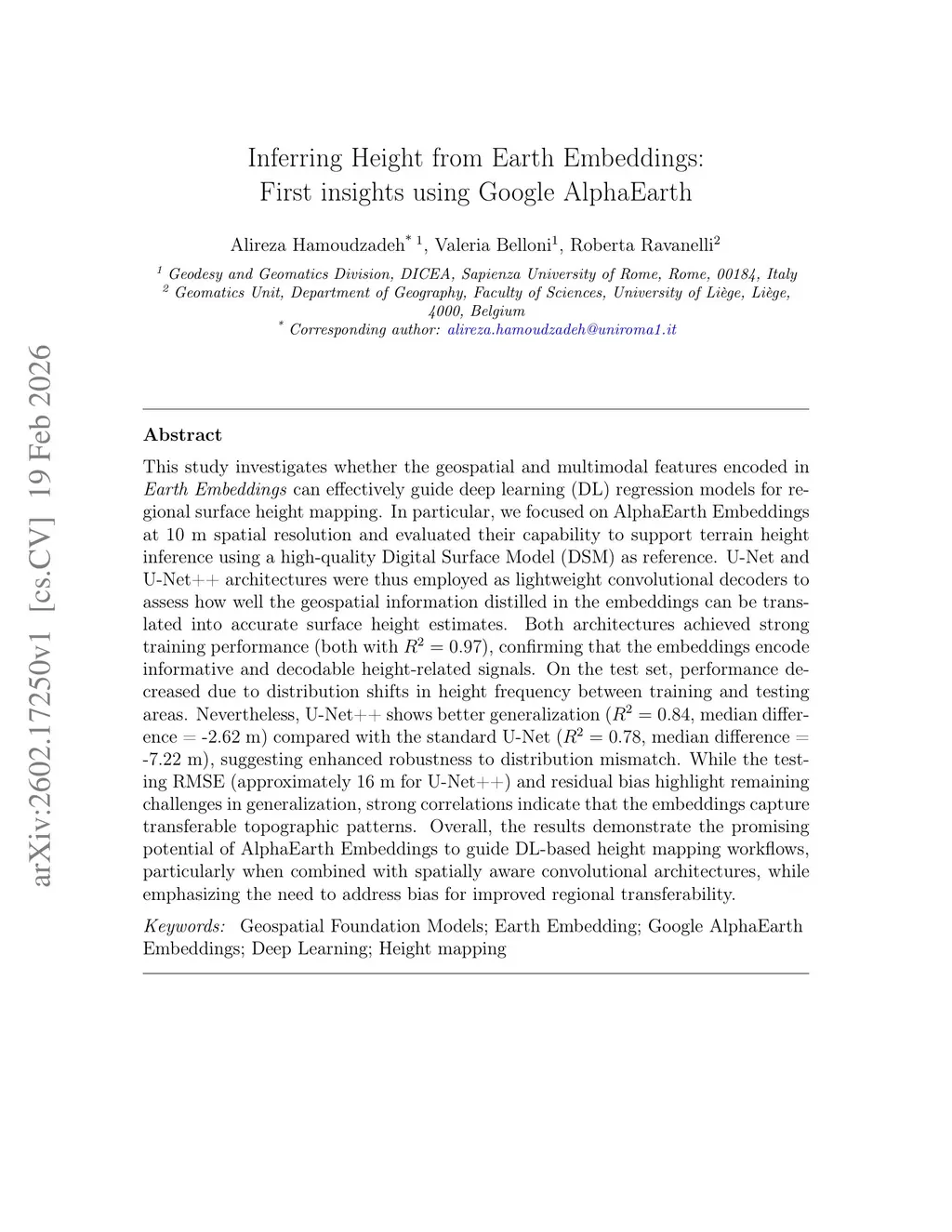 This study investigates whether the geospatial and multimodal features encoded in \textit{Earth Embeddings} can effectively guide deep learning (DL) regression models for regional surface height mapping. In particular, we focused on AlphaEarth Embeddings at 10 m spatial resolution and evaluated their capability to support terrain height inference using a high-quality Digital Surface Model (DSM) as reference. U-Net and U-Net++ architectures were thus employed as lightweight convolutional decoders to assess how well the geospatial information distilled in the embeddings can be translated into accurate surface height estimates. Both architectures achieved strong training performance (both with ), confirming that the embeddings encode informative and decodable height-related signals. On the test set, performance decreased due to distribution shifts in height frequency between training and testing areas. Nevertheless, U-Net++ shows better generalization (, median difference = -2.62 m) compared with the standard U-Net (, median difference = -7.22 m), suggesting enhanced robustness to distribution mismatch. While the testing RMSE (approximately 16 m for U-Net++) and residual bias highlight remaining challenges in generalization, strong correlations indicate that the embeddings capture transferable topographic patterns. Overall, the results demonstrate the promising potential of AlphaEarth Embeddings to guide DL-based height mapping workflows, particularly when combined with spatially aware convolutional architectures, while emphasizing the need to address bias for improved regional transferability.
