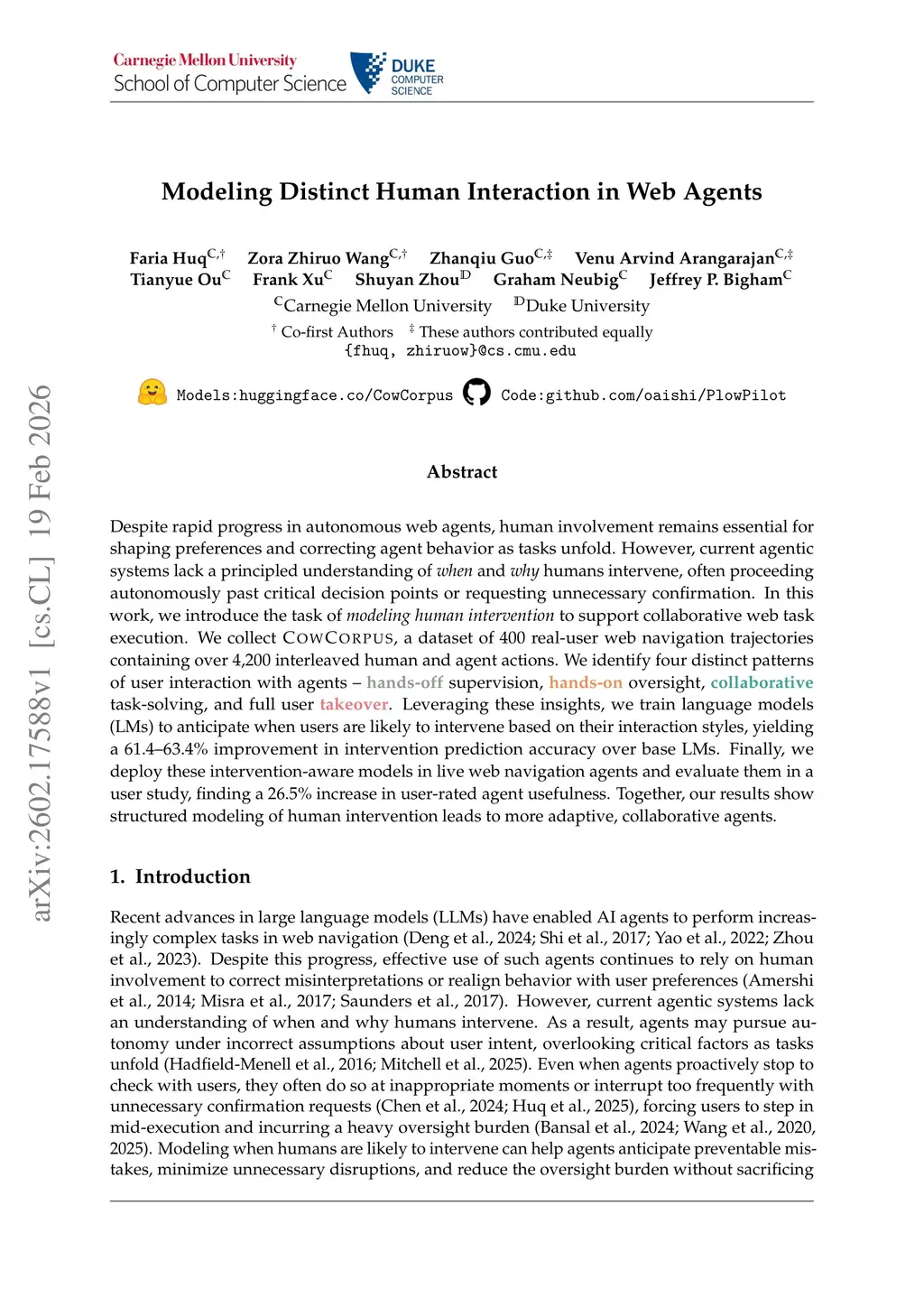 Despite rapid progress in autonomous web agents, human involvement remains essential for shaping preferences and correcting agent behavior as tasks unfold. However, current agentic systems lack a principled understanding of when and why humans intervene, often proceeding autonomously past critical decision points or requesting unnecessary confirmation. In this work, we introduce the task of modeling human intervention to support collaborative web task execution. We collect CowCorpus, a dataset of 400 real-user web navigation trajectories containing over 4,200 interleaved human and agent actions. We identify four distinct patterns of user interaction with agents -- hands-off supervision, hands-on oversight, collaborative task-solving, and full user takeover. Leveraging these insights, we train language models (LMs) to anticipate when users are likely to intervene based on their interaction styles, yielding a 61.4-63.4% improvement in intervention prediction accuracy over base LMs. Finally, we deploy these intervention-aware models in live web navigation agents and evaluate them in a user study, finding a 26.5% increase in user-rated agent usefulness. Together, our results show structured modeling of human intervention leads to more adaptive, collaborative agents.
